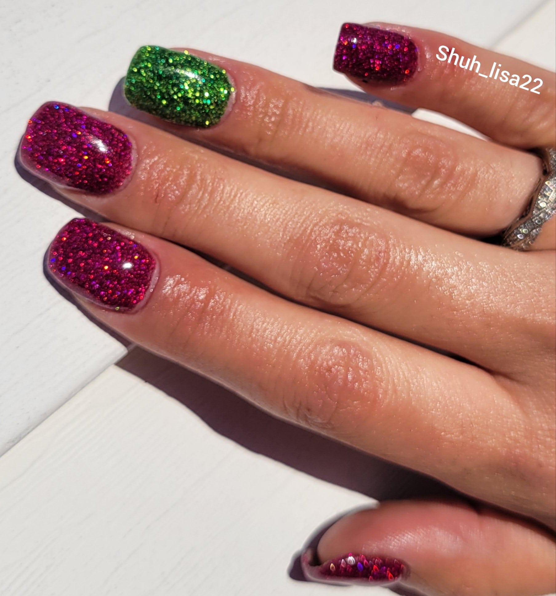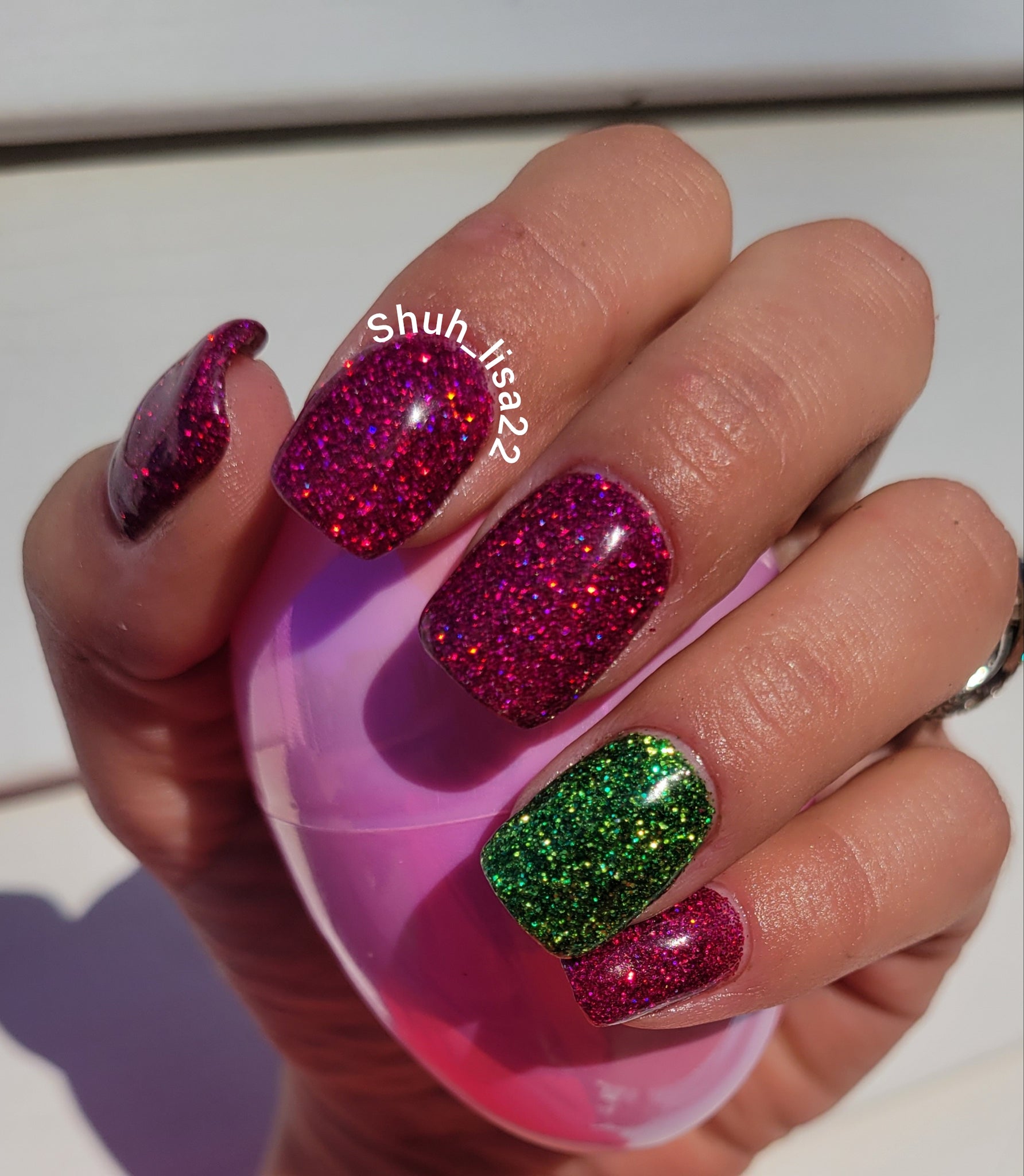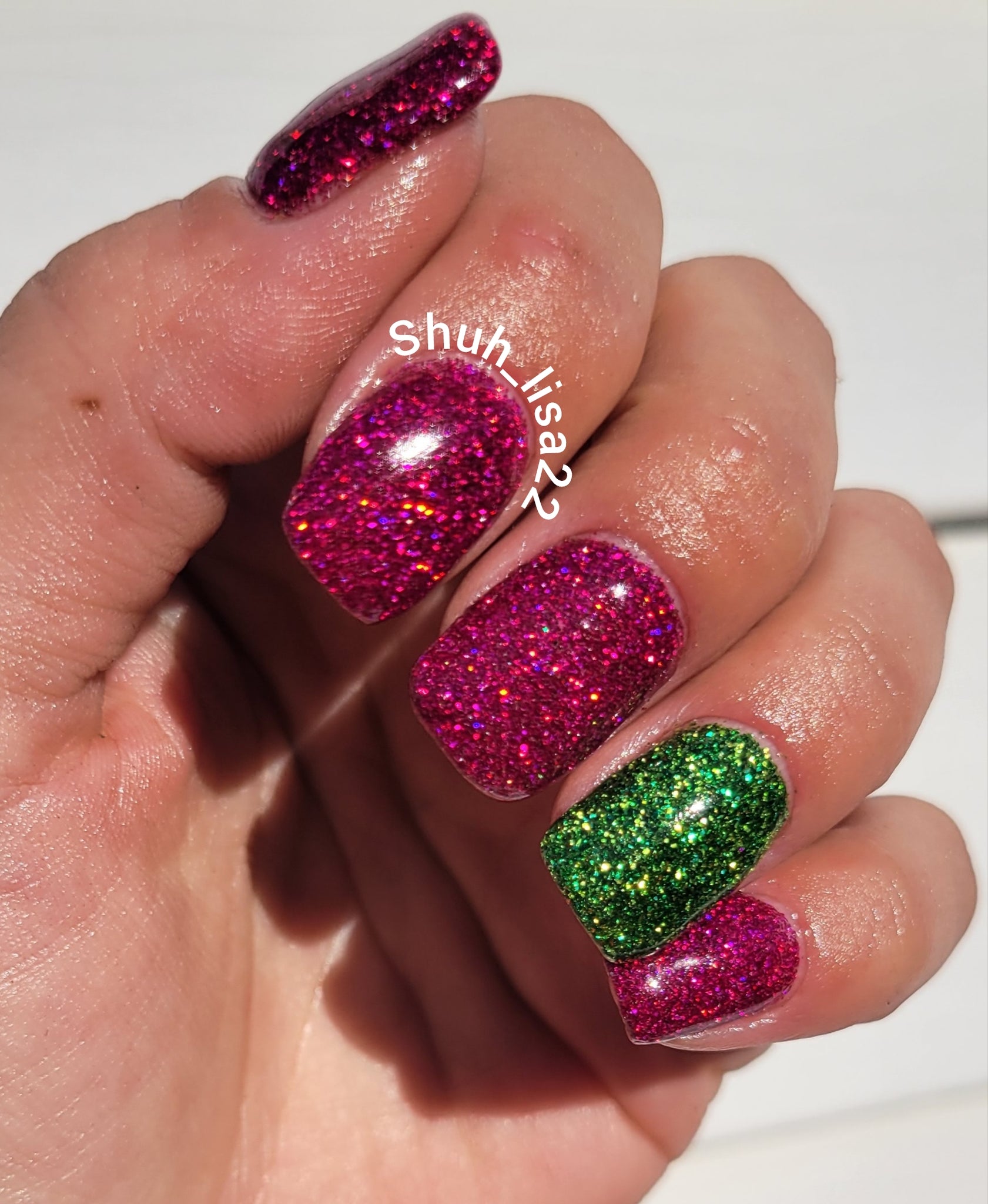 Green Acres is a clear dip base loaded with multiple shades of holographic green glitter.