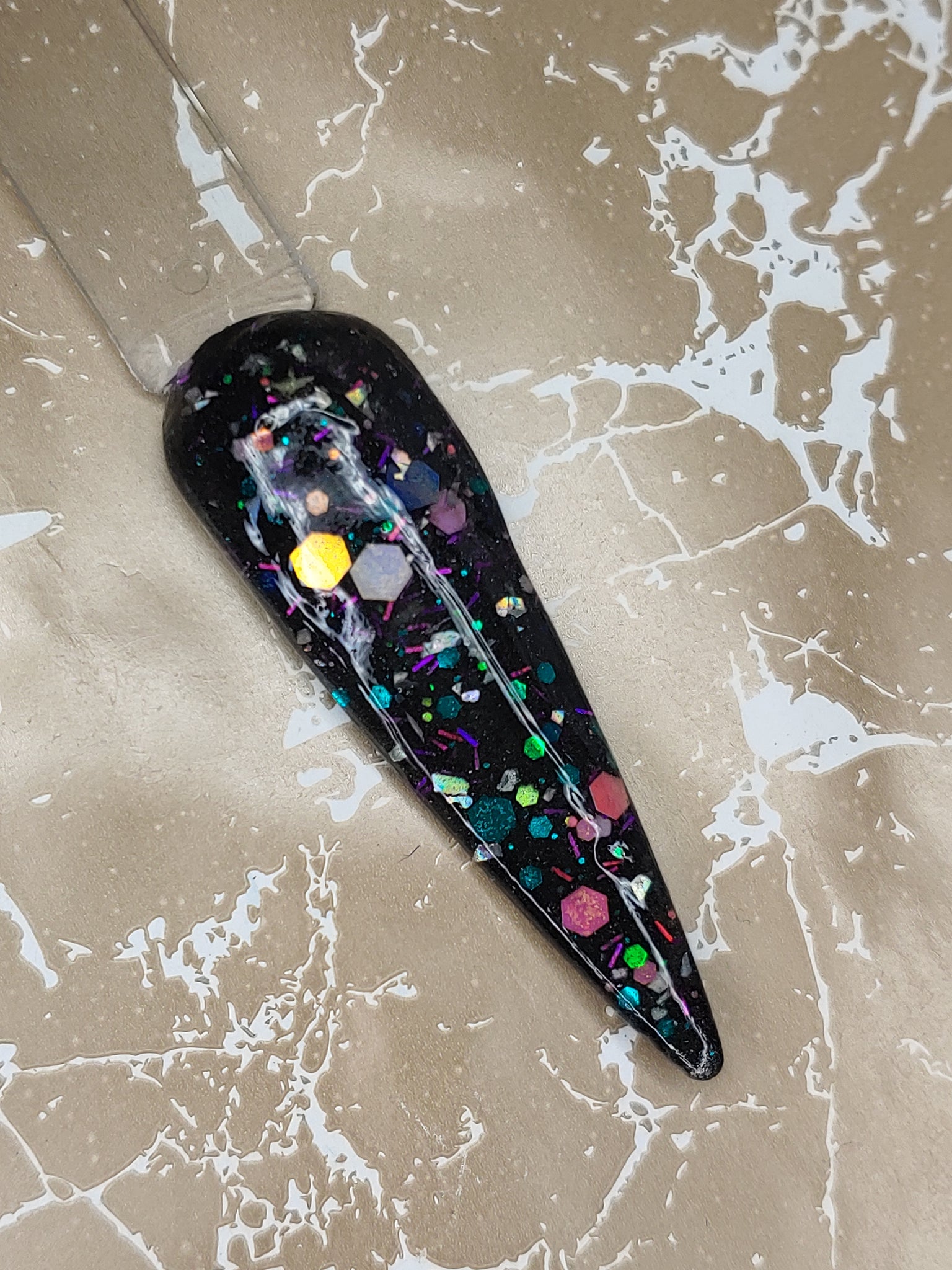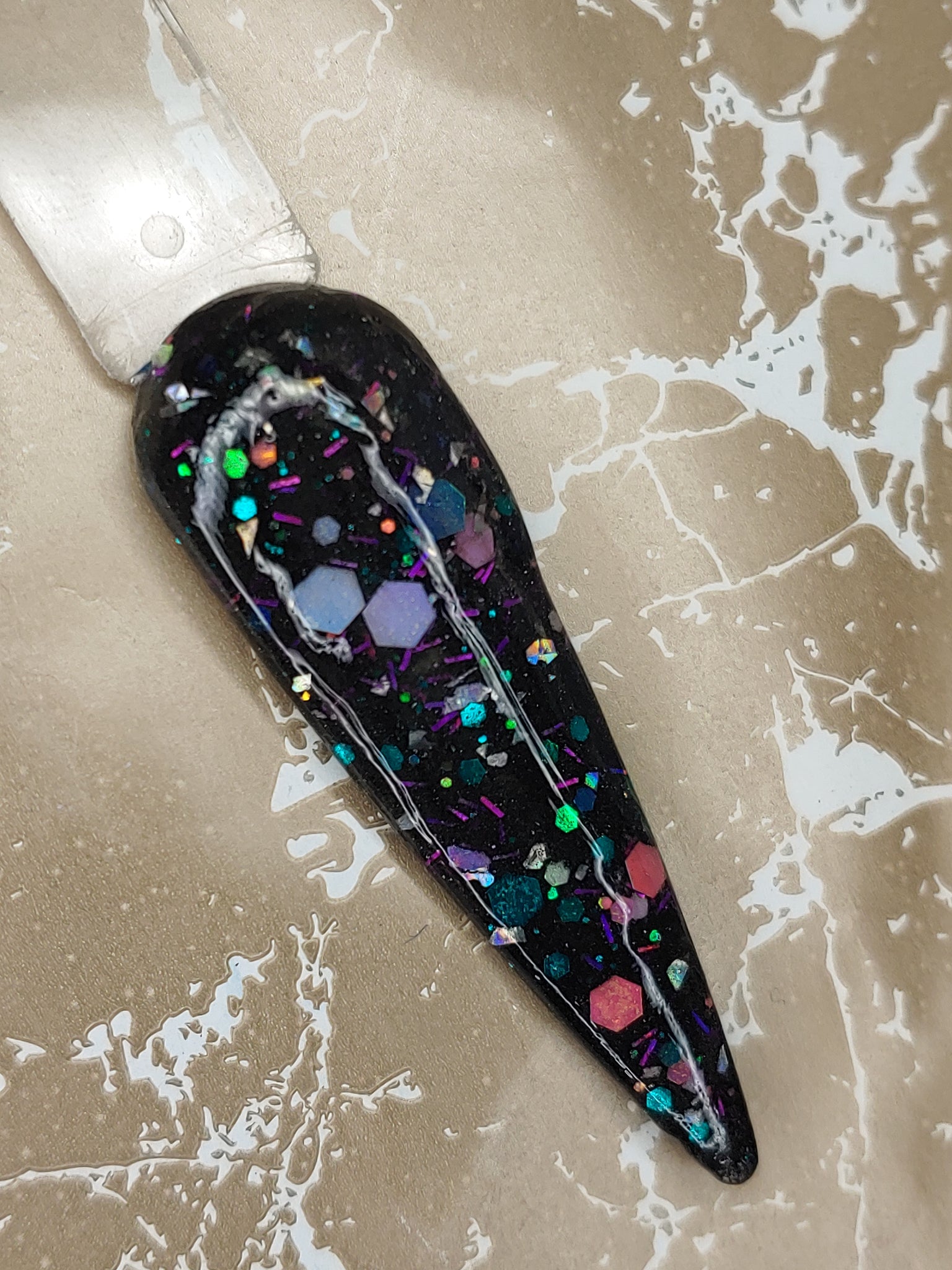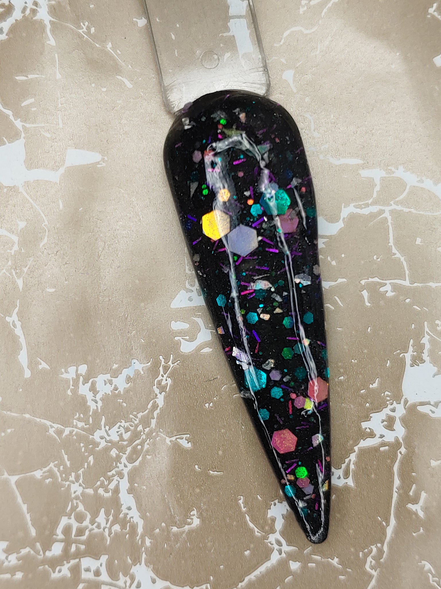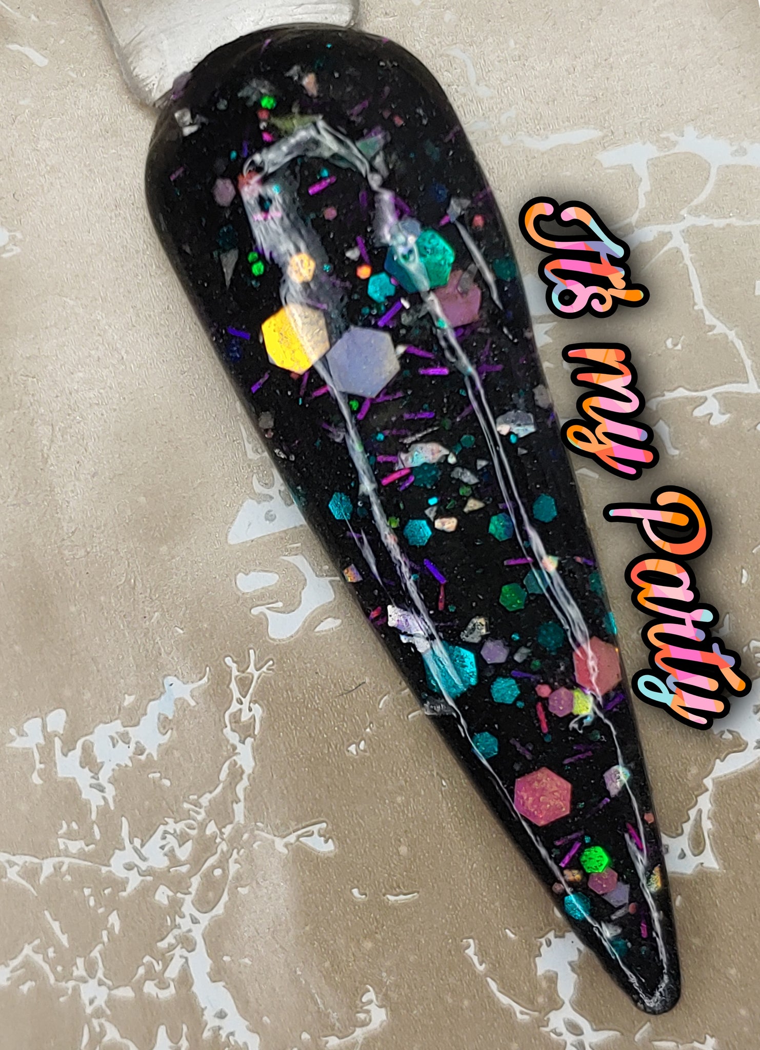 It's my Party is a black shimmer base with color-shifting small, medium, and chunky holographic glitter and color-shifting tinsel glitter
