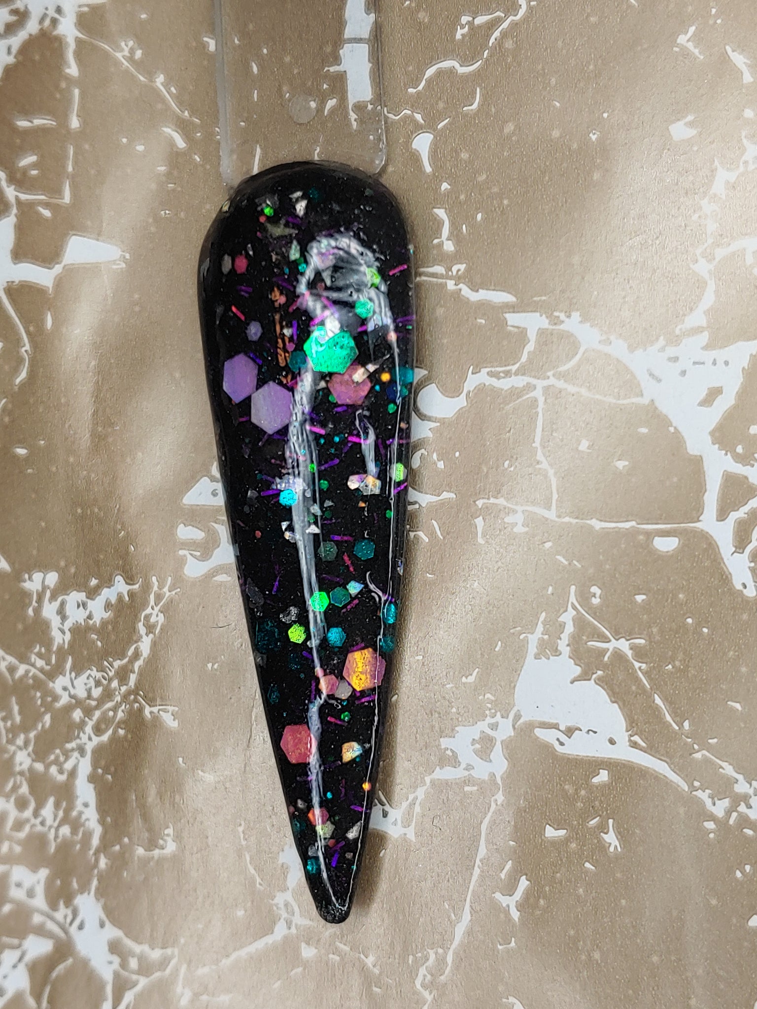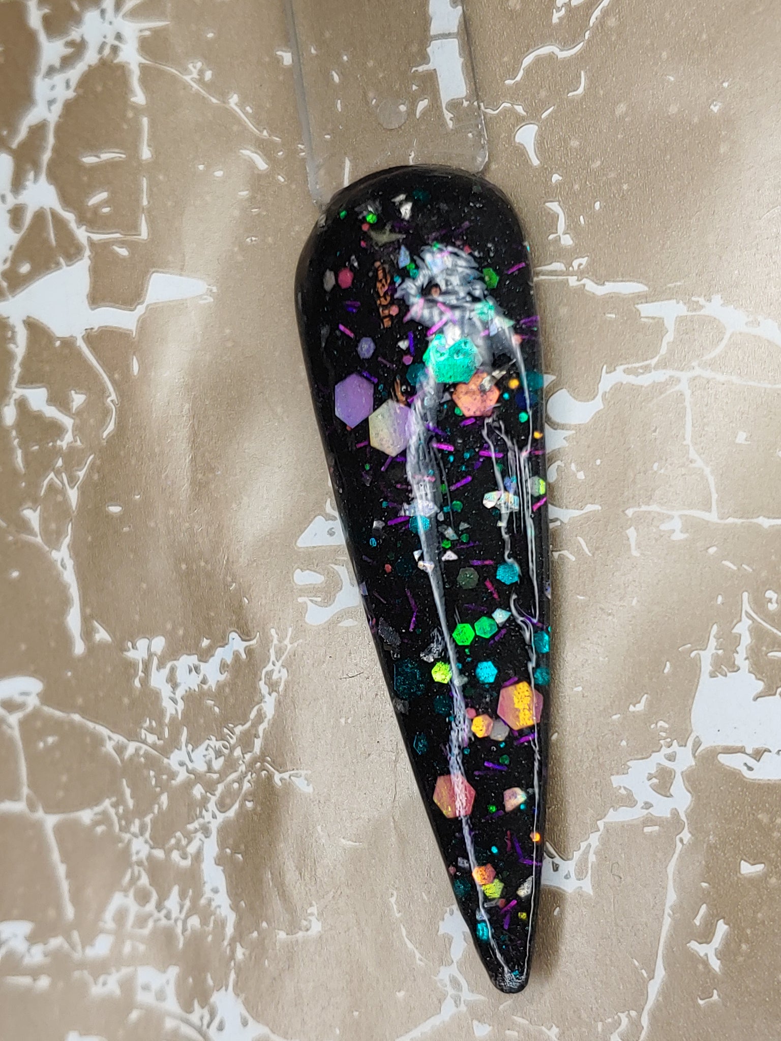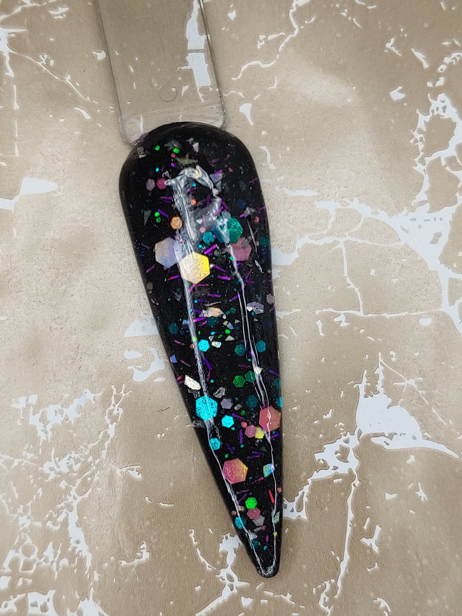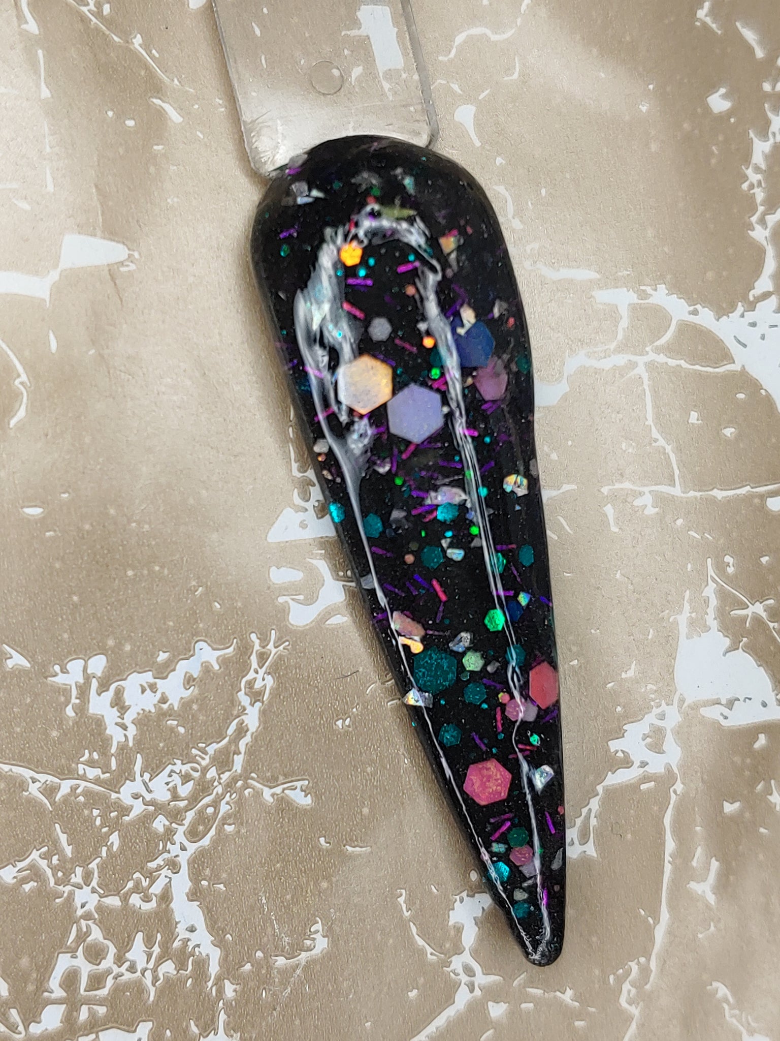 It's my Party is a black shimmer base with color-shifting small, medium, and chunky holographic glitter and color-shifting tinsel glitter