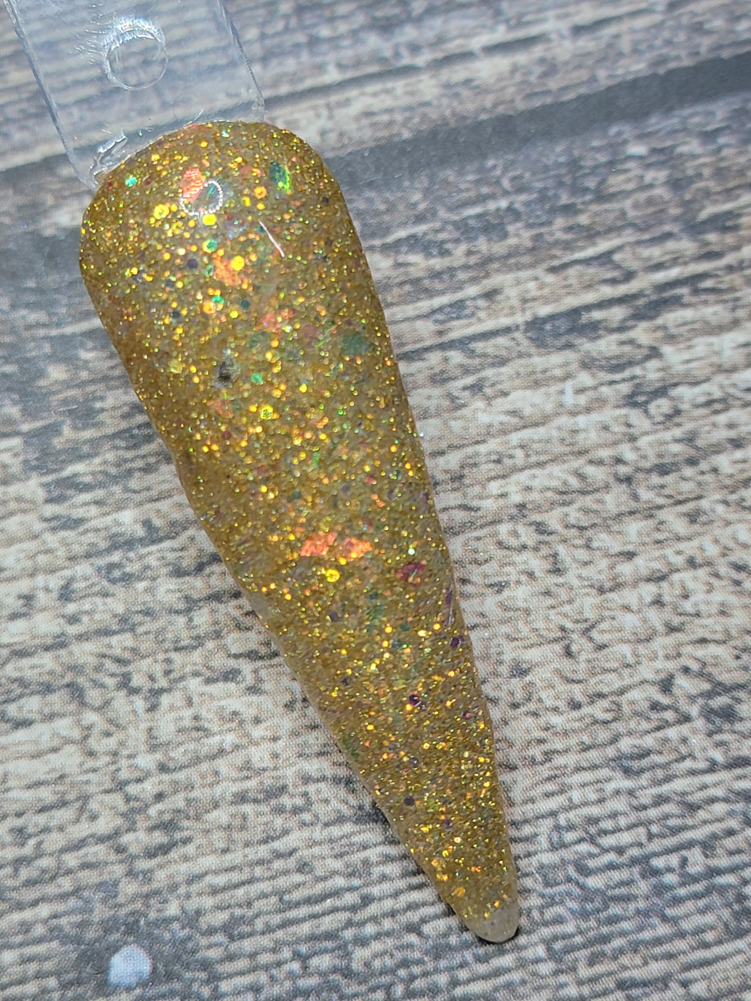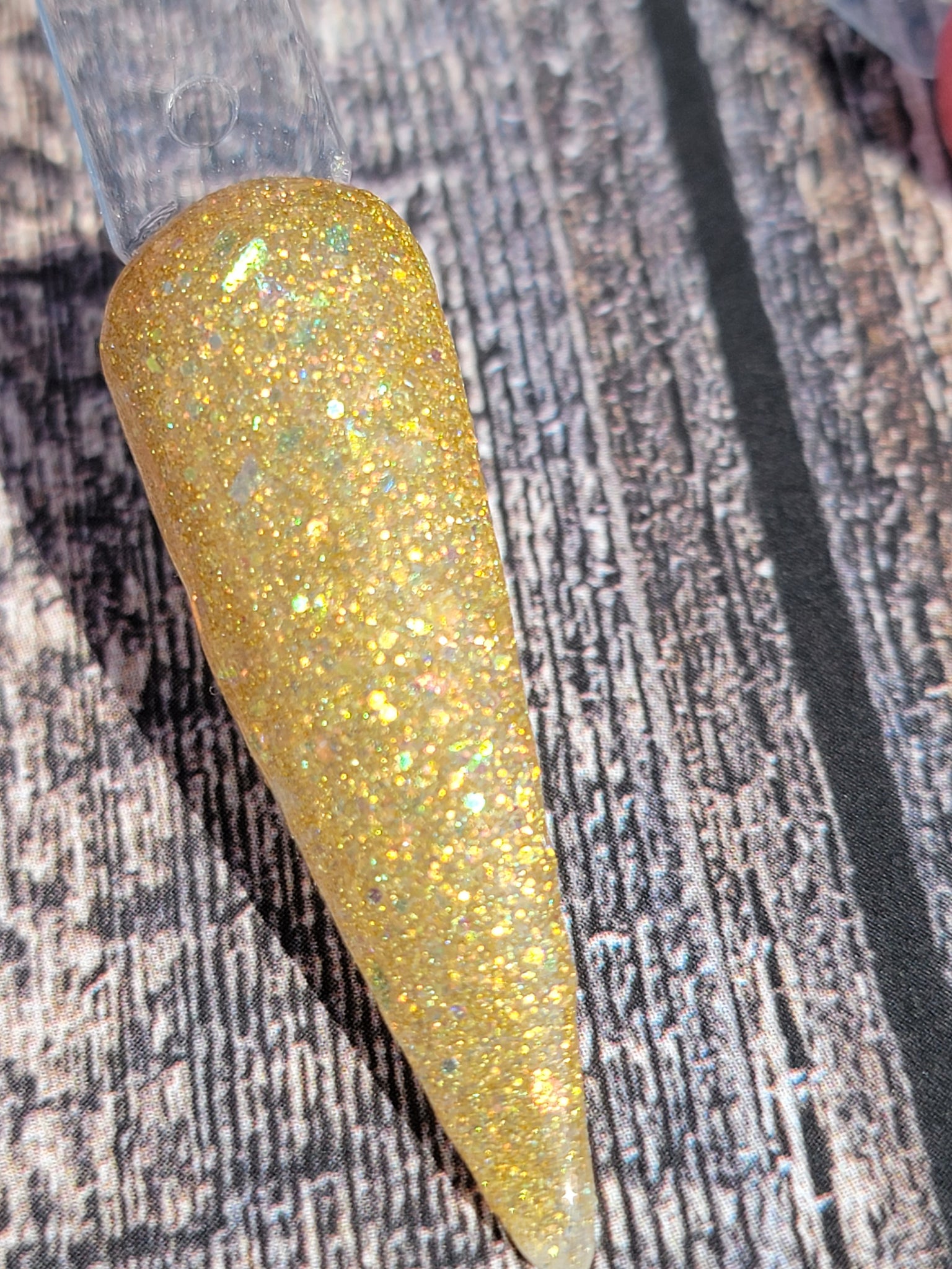 Knock Out is a clear dip base with holographic gold color-shifting glitter and iridescent color-shifting flakes.