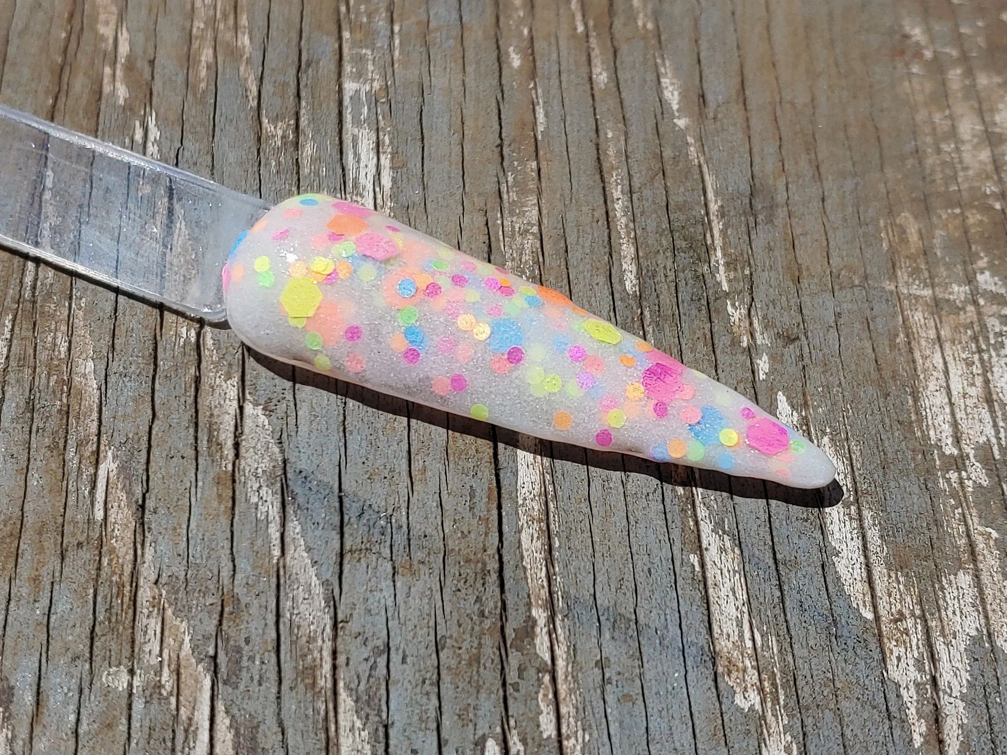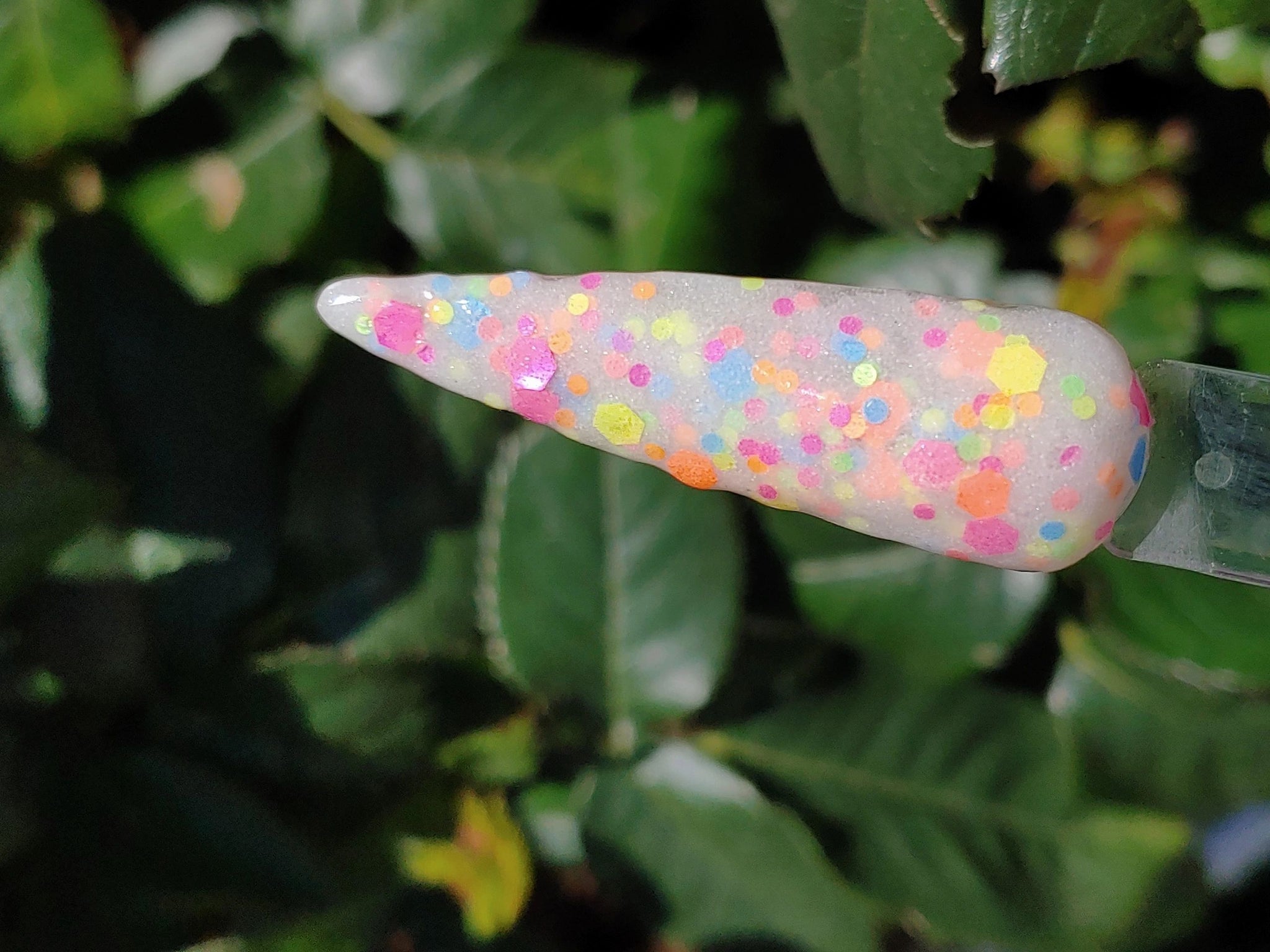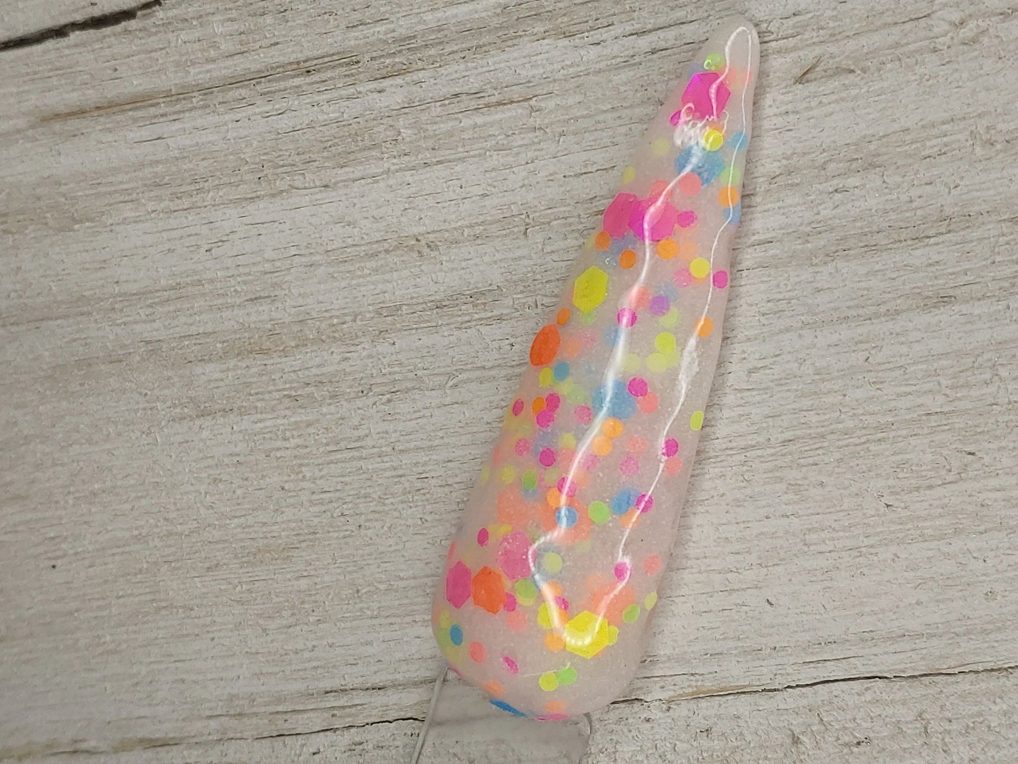 Neon Party Lights is a milky white glittery base with both medium and chunky-sized orange, pink, yellow, blue, green, and purple neon matte glitter.