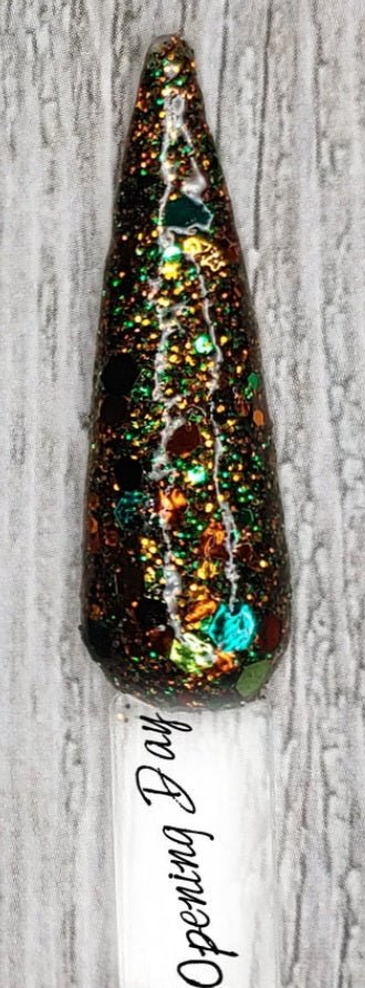 Opening Day is a clear dip base with green to teal color-shifting glitter, gold to copper color-shifting glitter, as well as green, teal, orange and brown holographic chunky glitter.