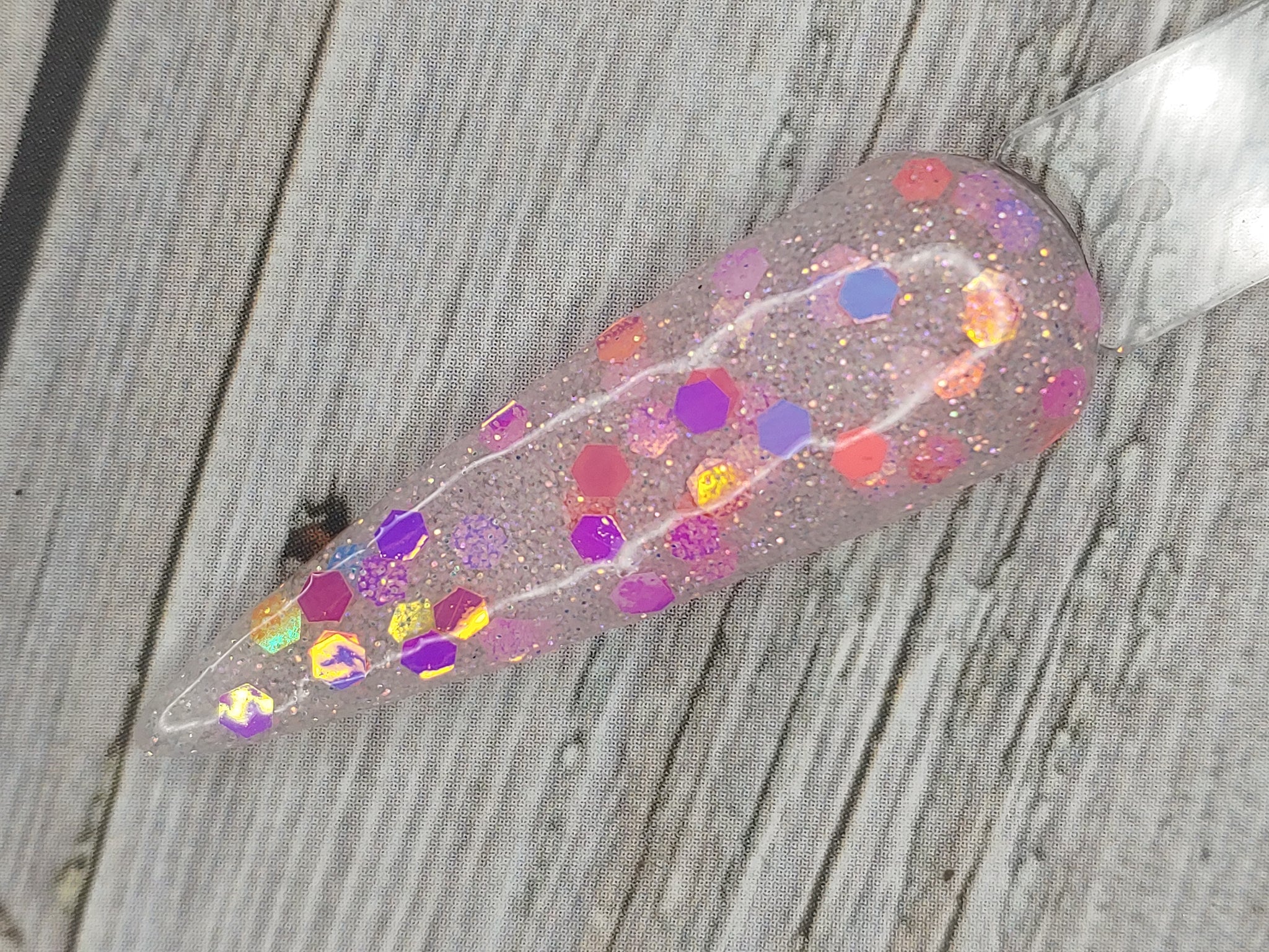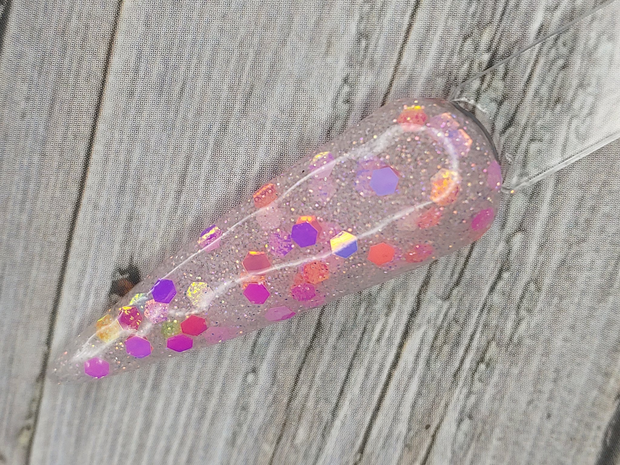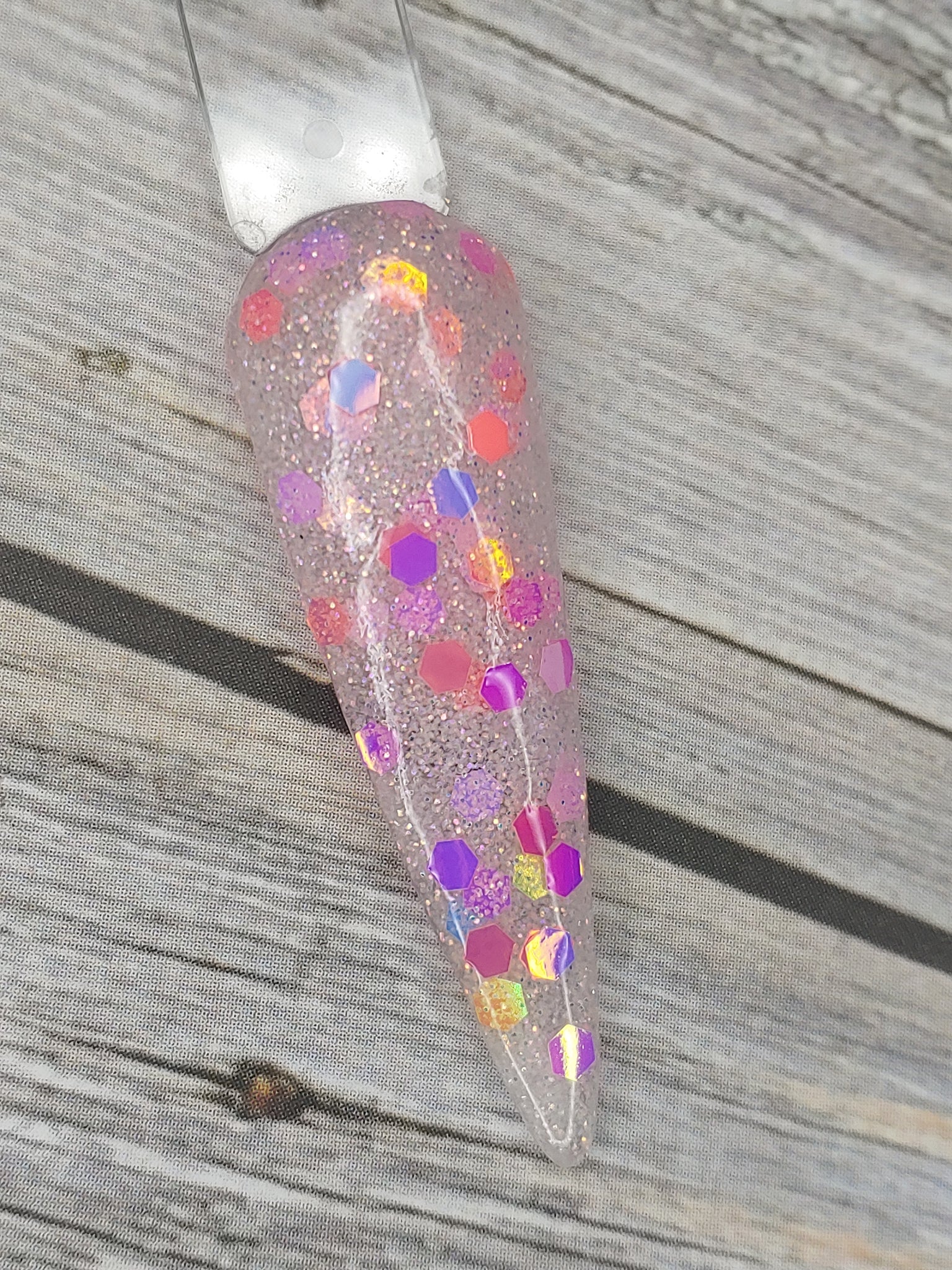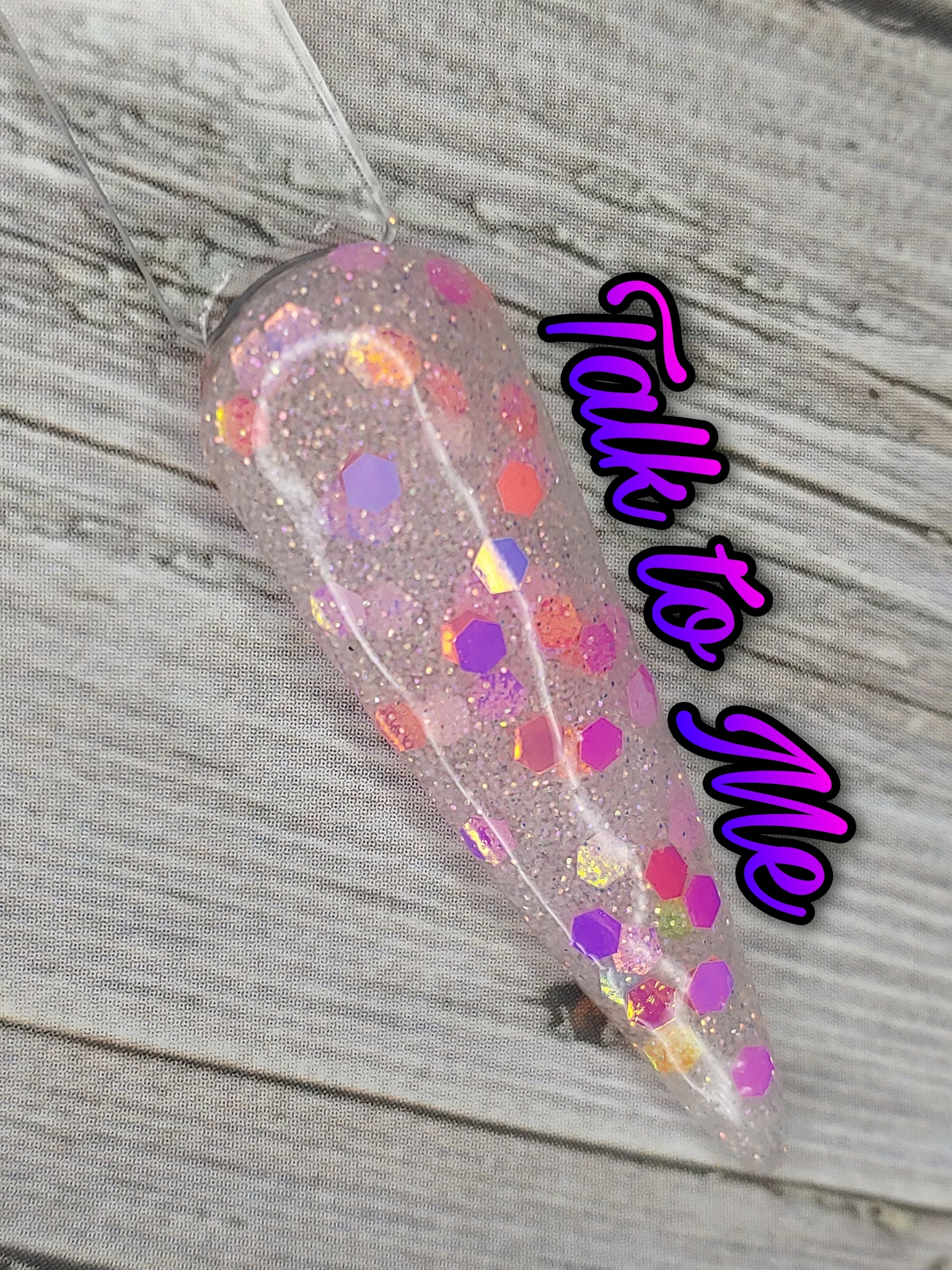 Talk to Me is a clear dip base with fine pink and silver glitter and chunky-sized pink color-shifting glitter.