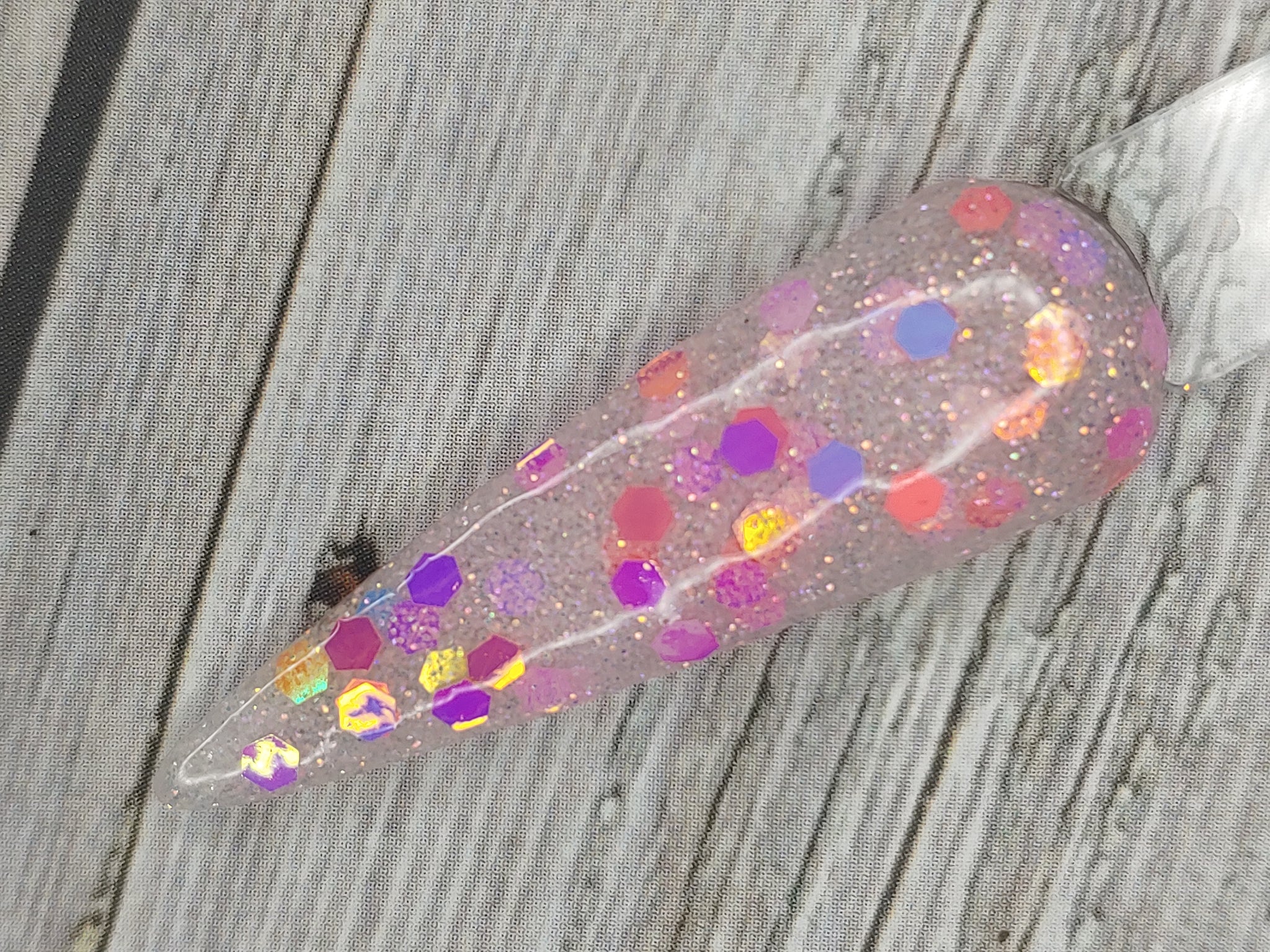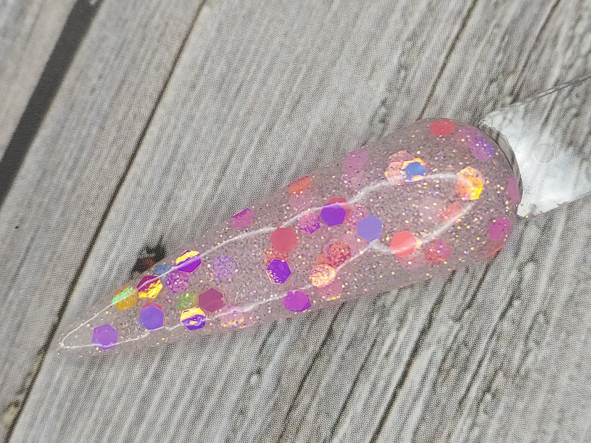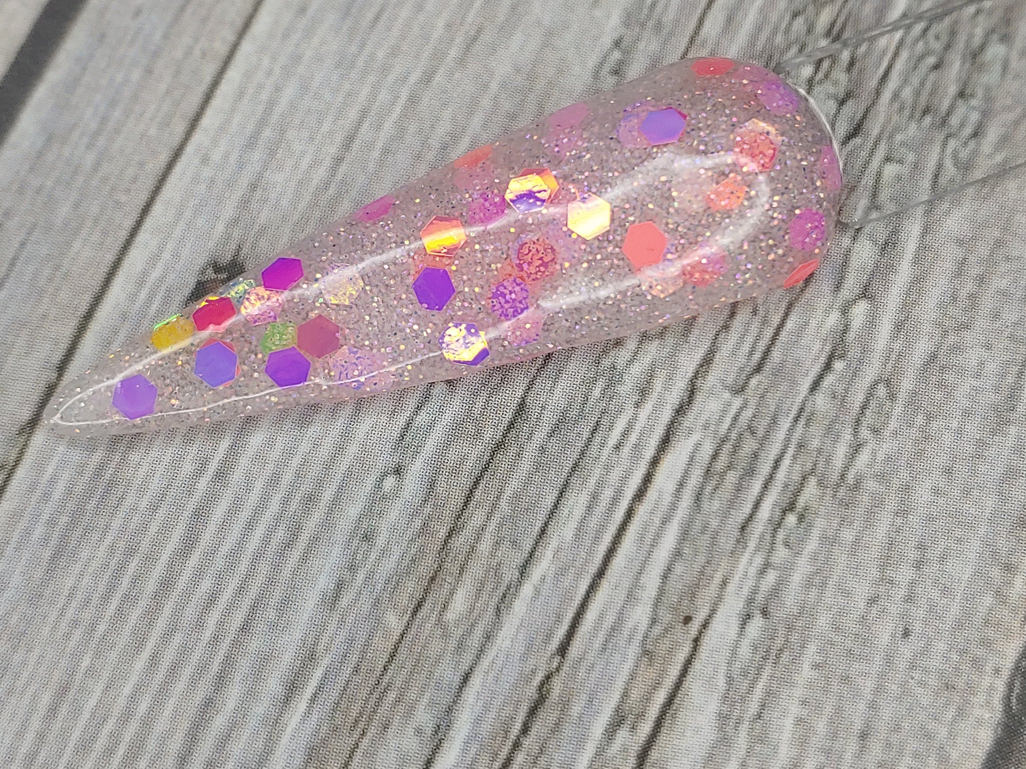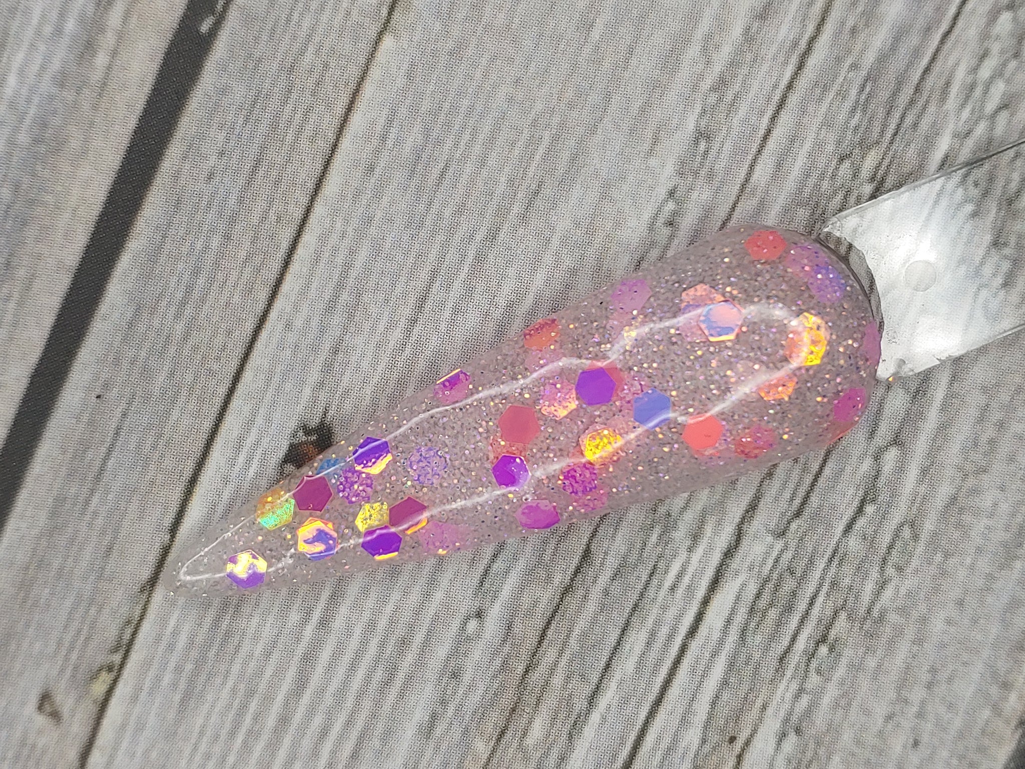 Talk to Me is a clear dip base with fine pink and silver glitter and chunky-sized pink color-shifting glitter.