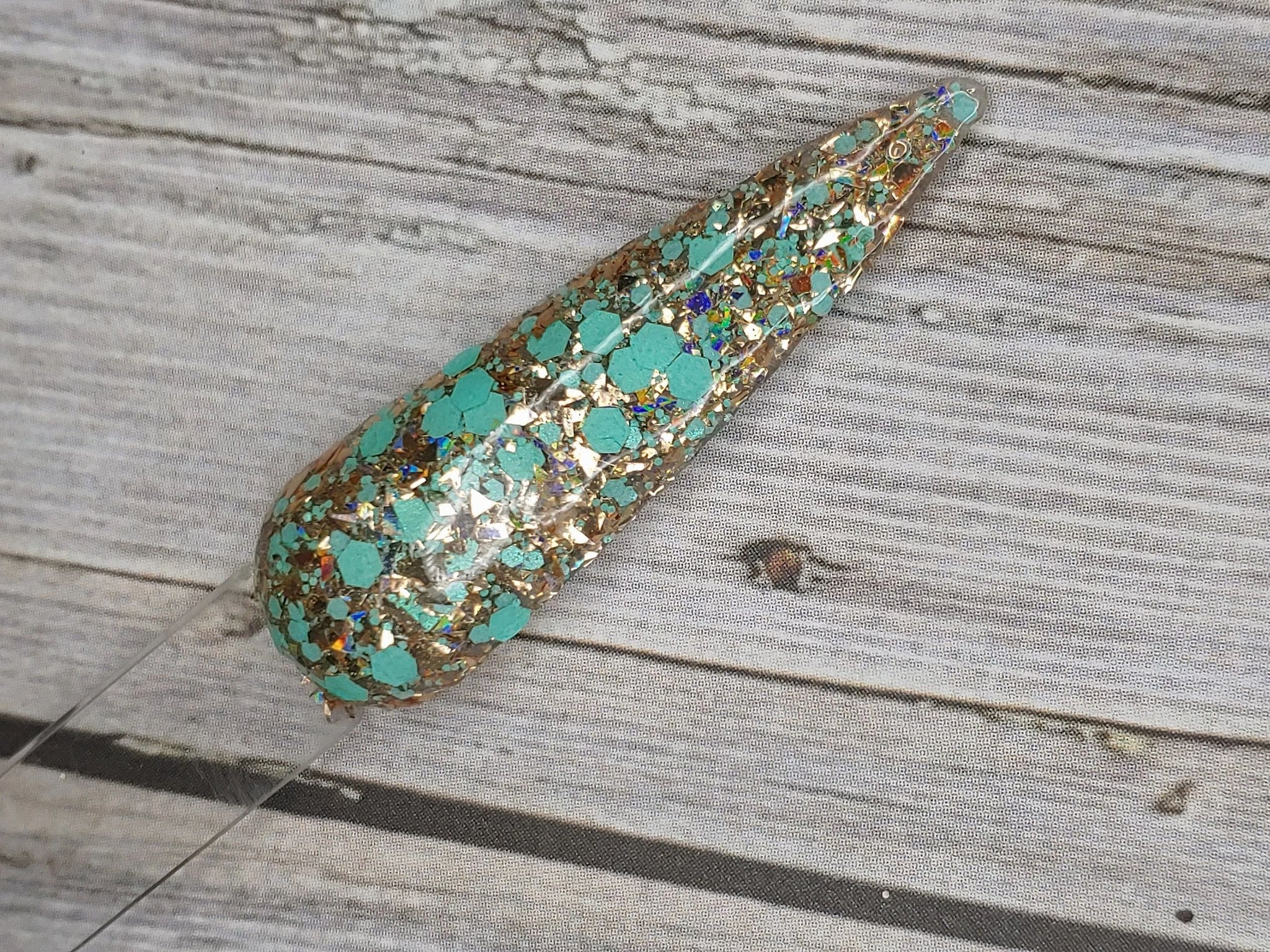 Woah Nelly is a clear dip base with holographic gold glitter shards, silver color-shifting glitter shards, and small and medium-sized matte turquoise glitter.