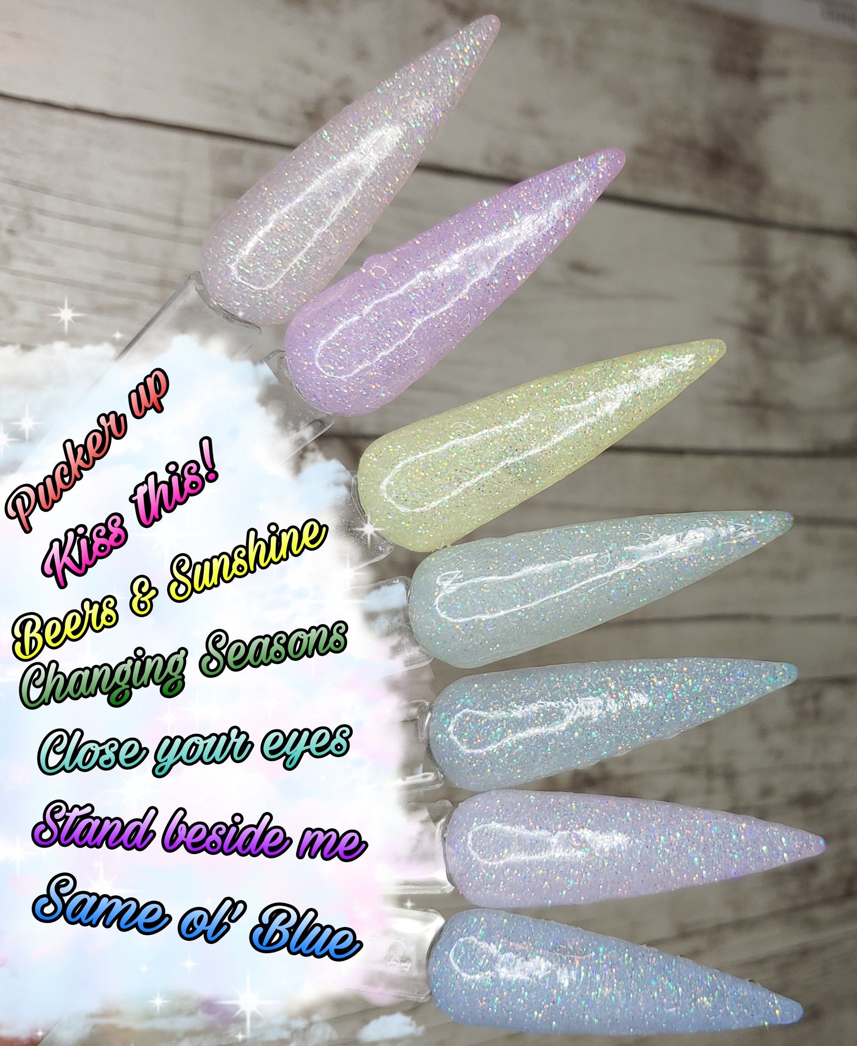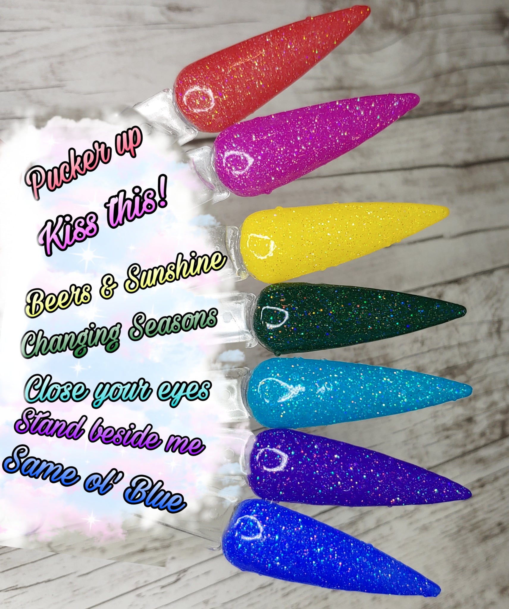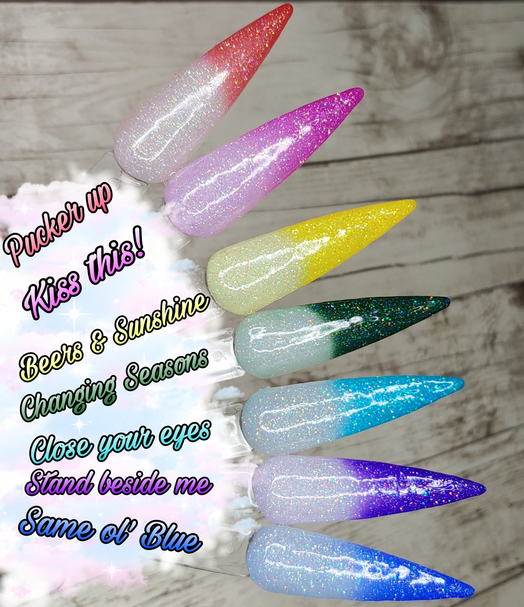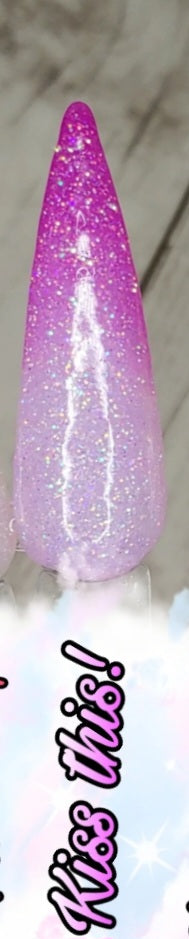 Kiss This! Is a magenta to very light pale pink thermal with rainbow iridescent glitter. This dip will change from a light pale pink when hot to a gorgeous magenta when cold