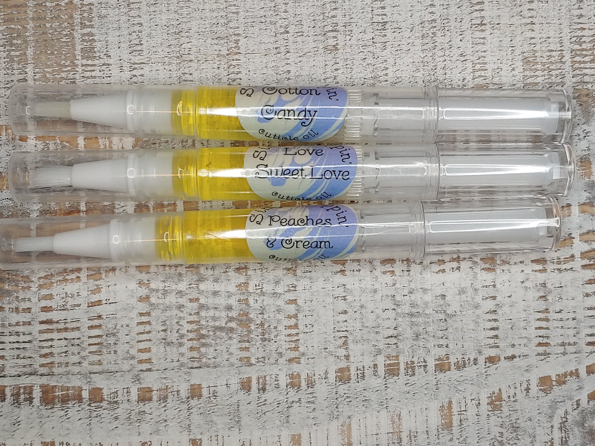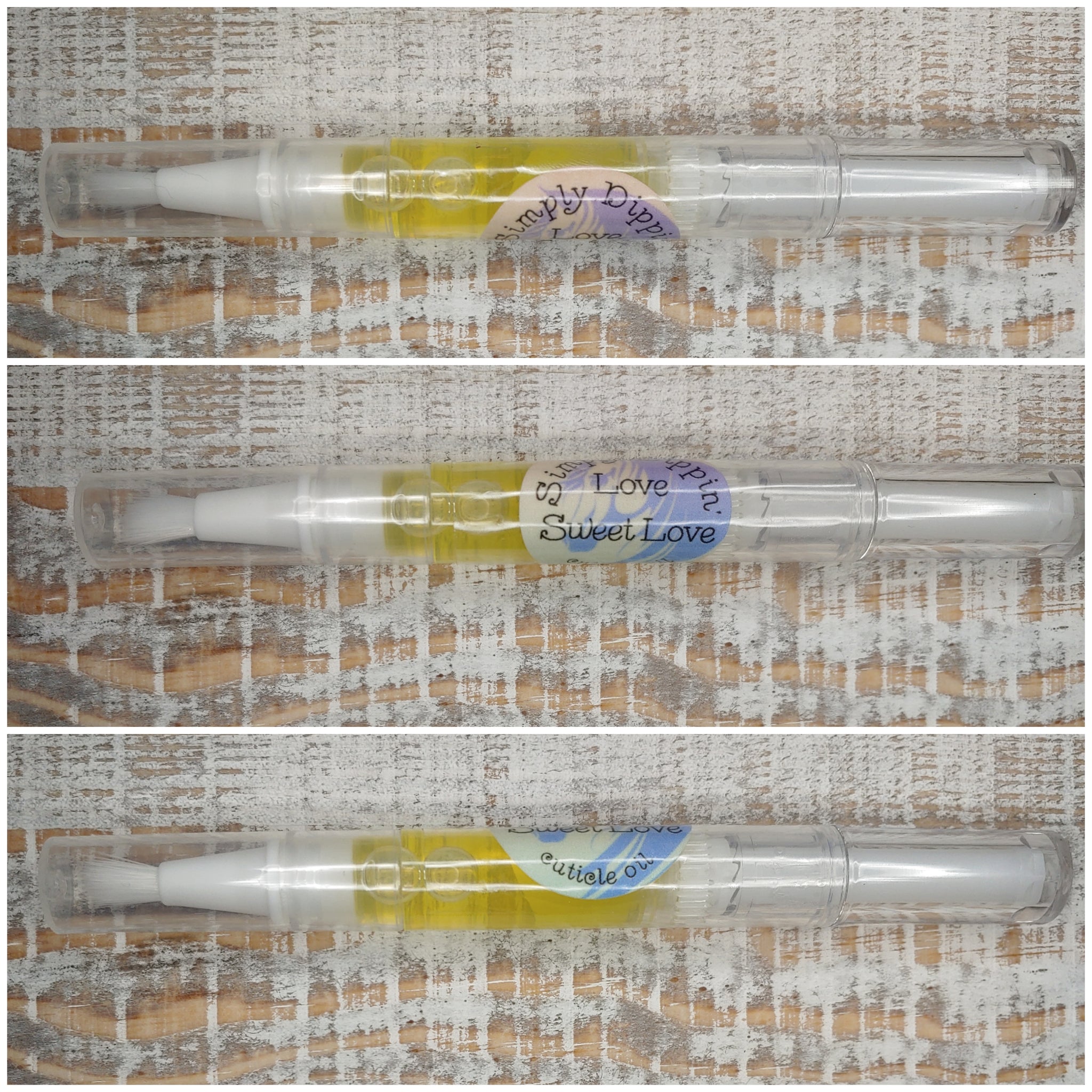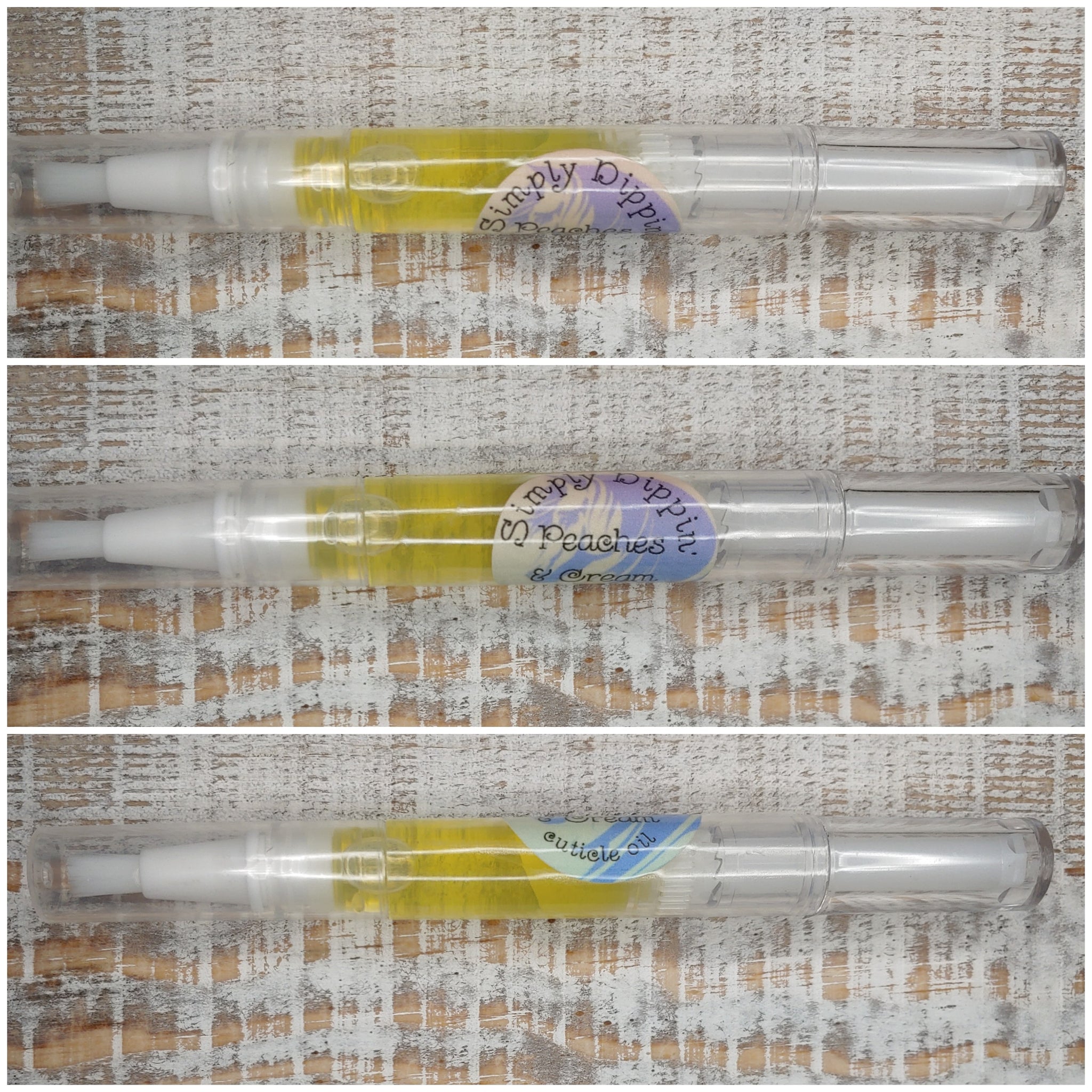 Our cuticle care pens are made with 100% Jojoba and Vitamin E oils. We do add premium fragrances for scent. Jojoba oil has many benefits, including its moisturizing ability, natural antifungal properties, and the fact that it's hypoallergenic. Both jojoba and Vitamin E oils are antioxidants, they promote nail growth, and have been used to help speed up wound healing and reduce scarring. These oils keep the problem areas moisturized while the nutrients soak into the skin and nails. These cuticle care pens make it easy to get into all the narrow areas of the cuticles, sidewalls, and especially under the nail where the nail meets the skin.