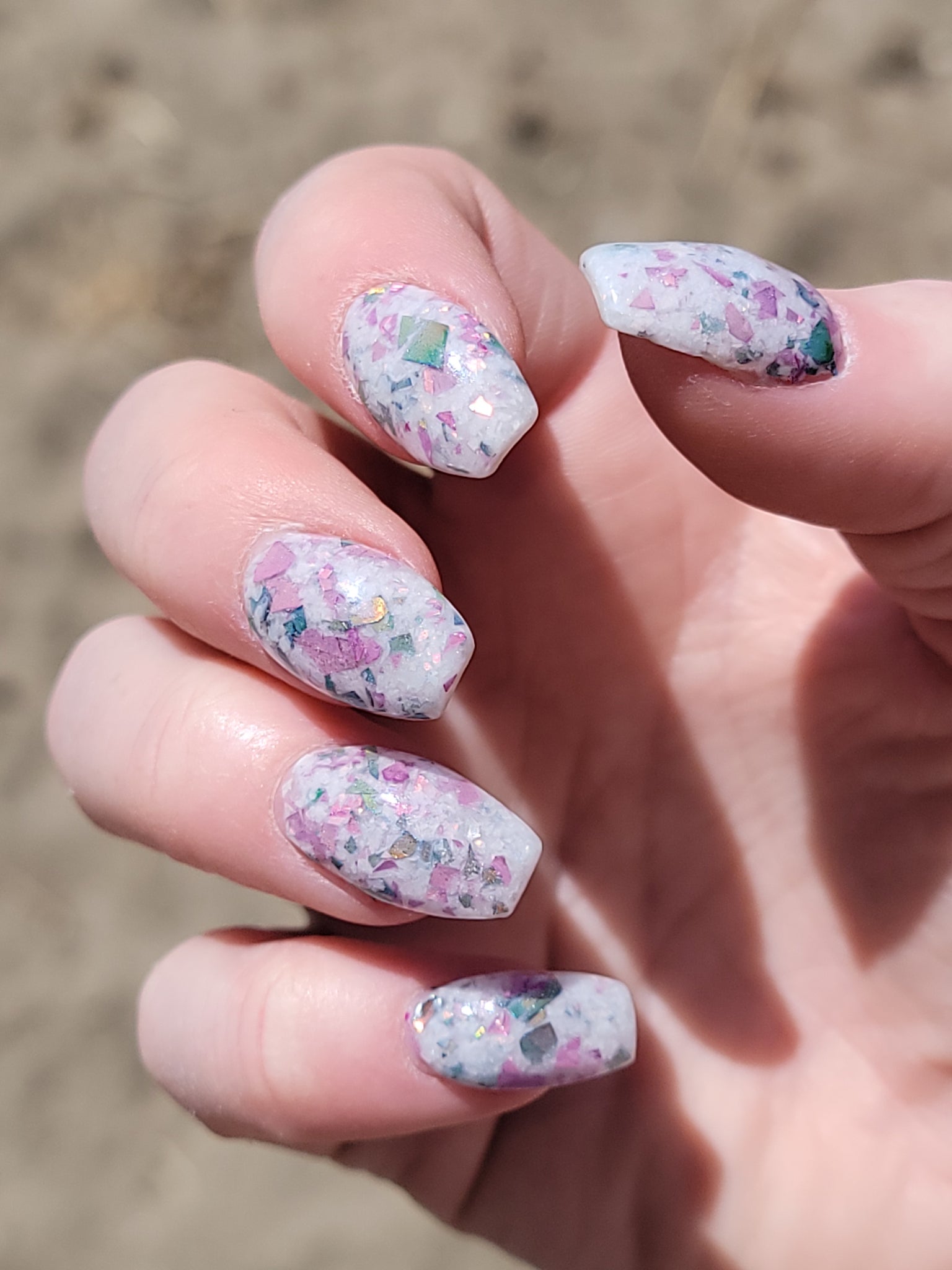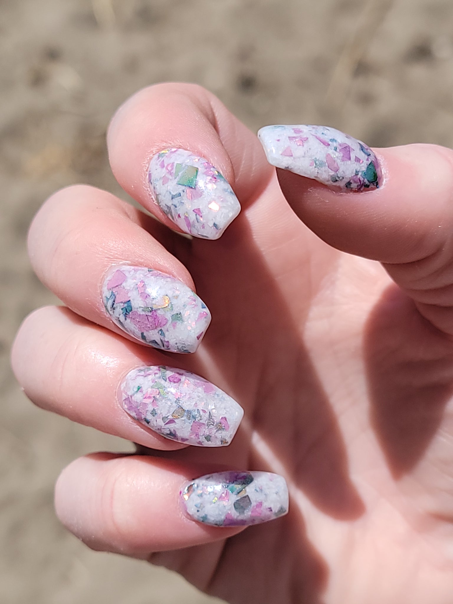 Fancy Like, Oh is a light ivory base with iridescent flakies and both green and pink color-shifting flakes.