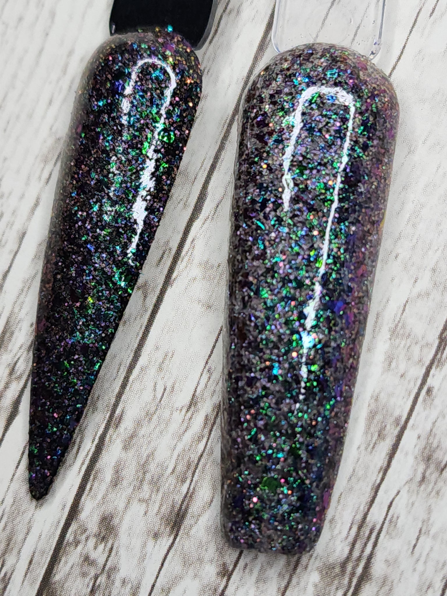 Glitterati is a clear base with color shifting glitter and flakies. Left swatch is one dip over black.