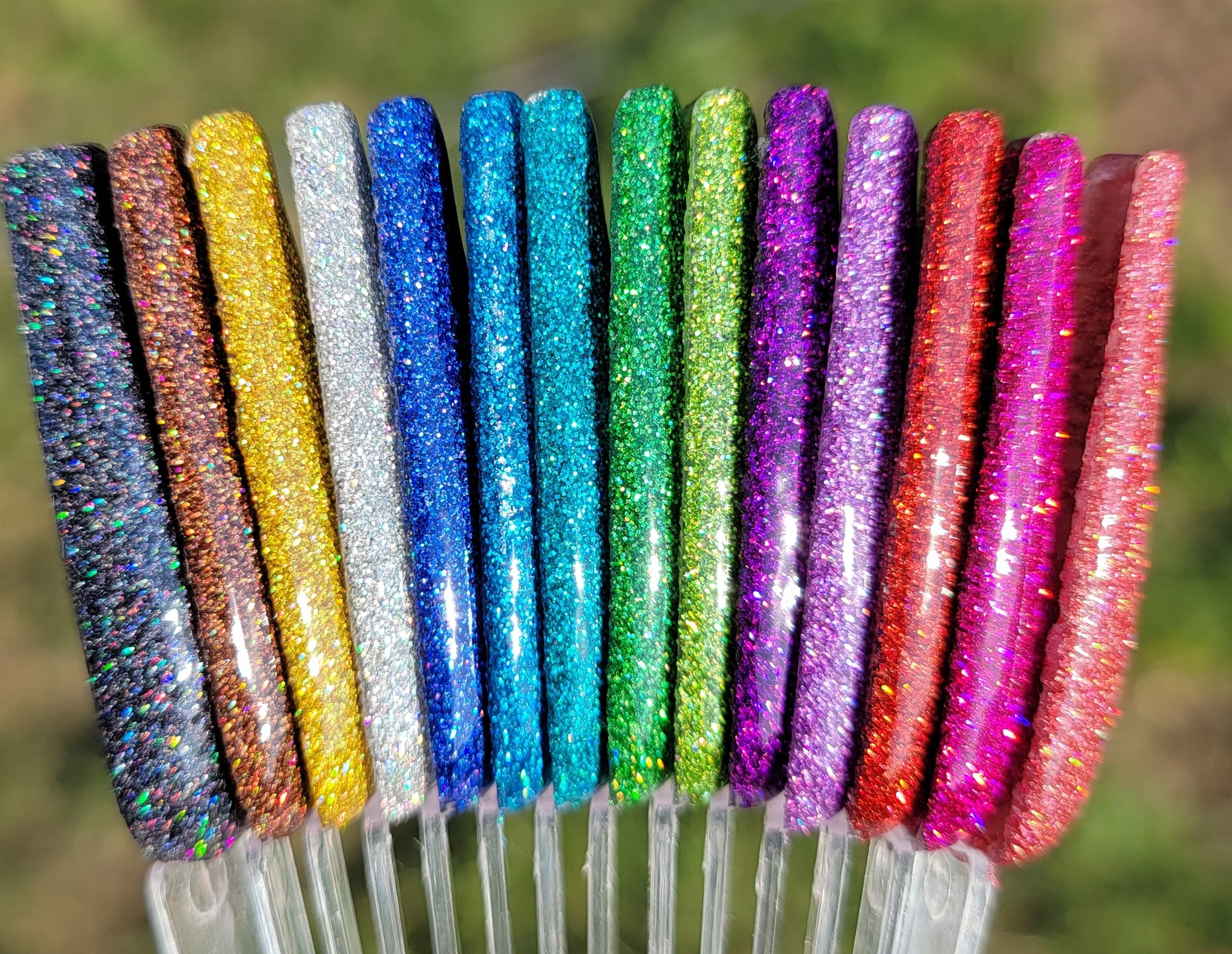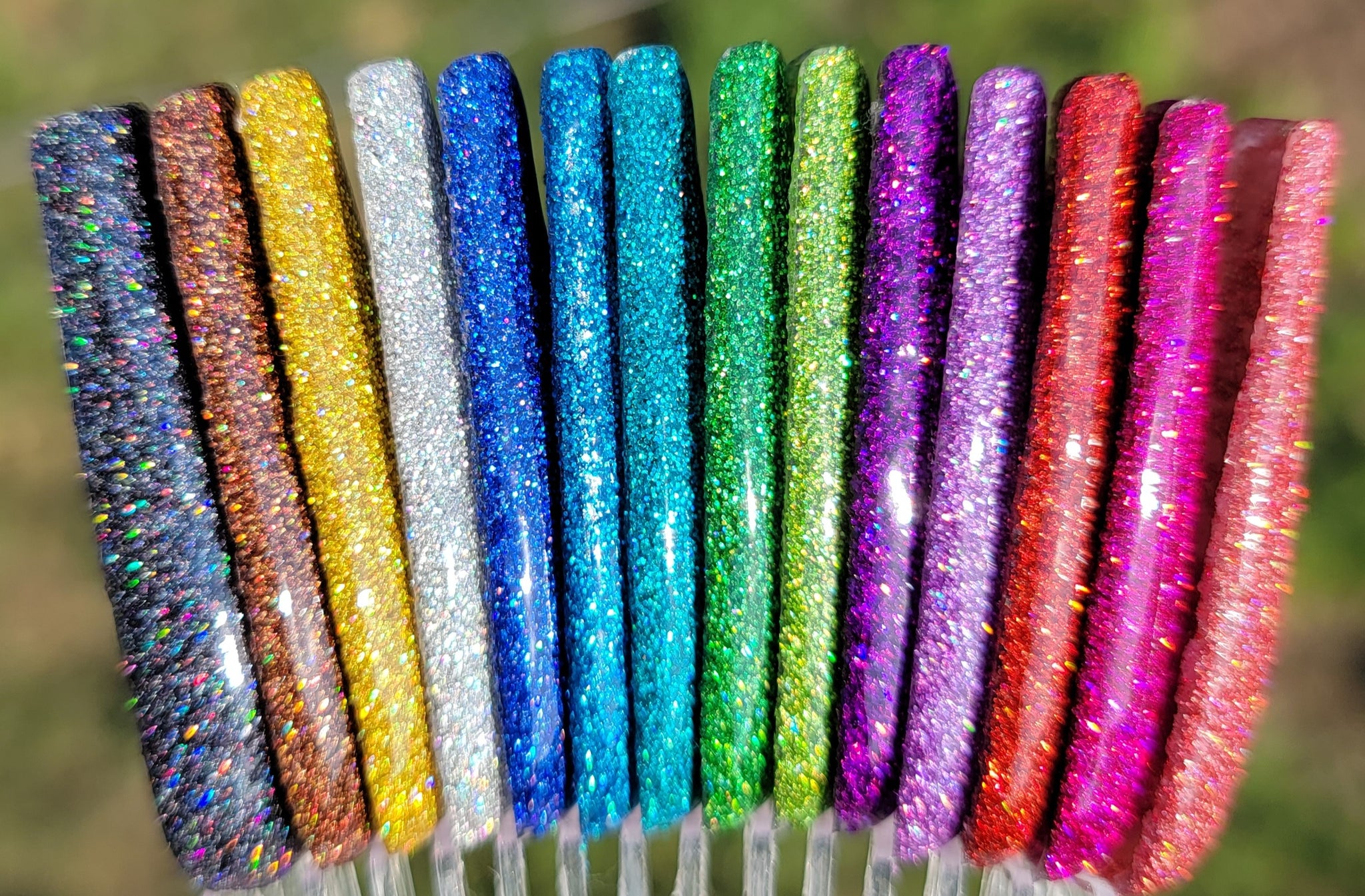 The Holo Collection contains fourteen .25oz ultrafine holographic glitter dips.