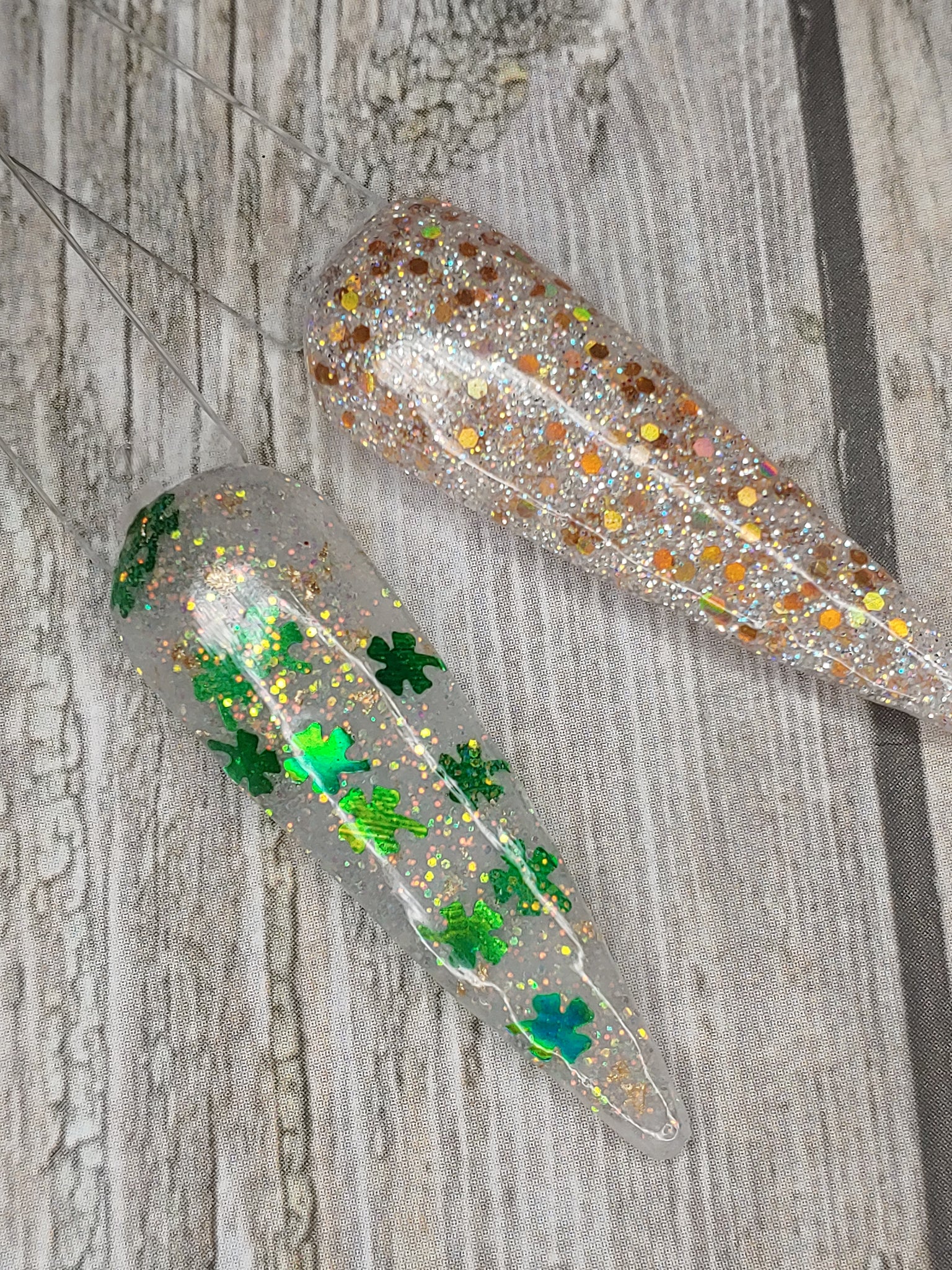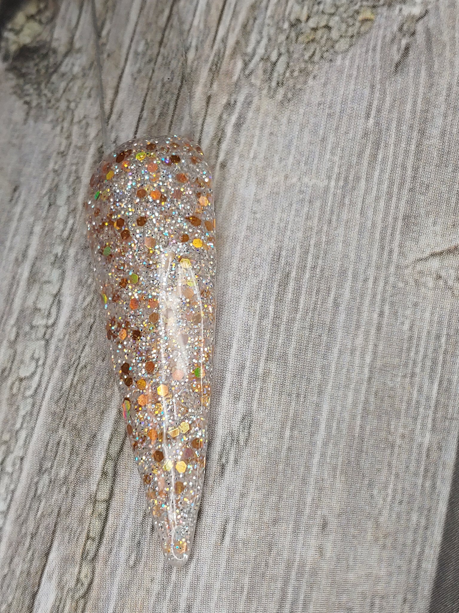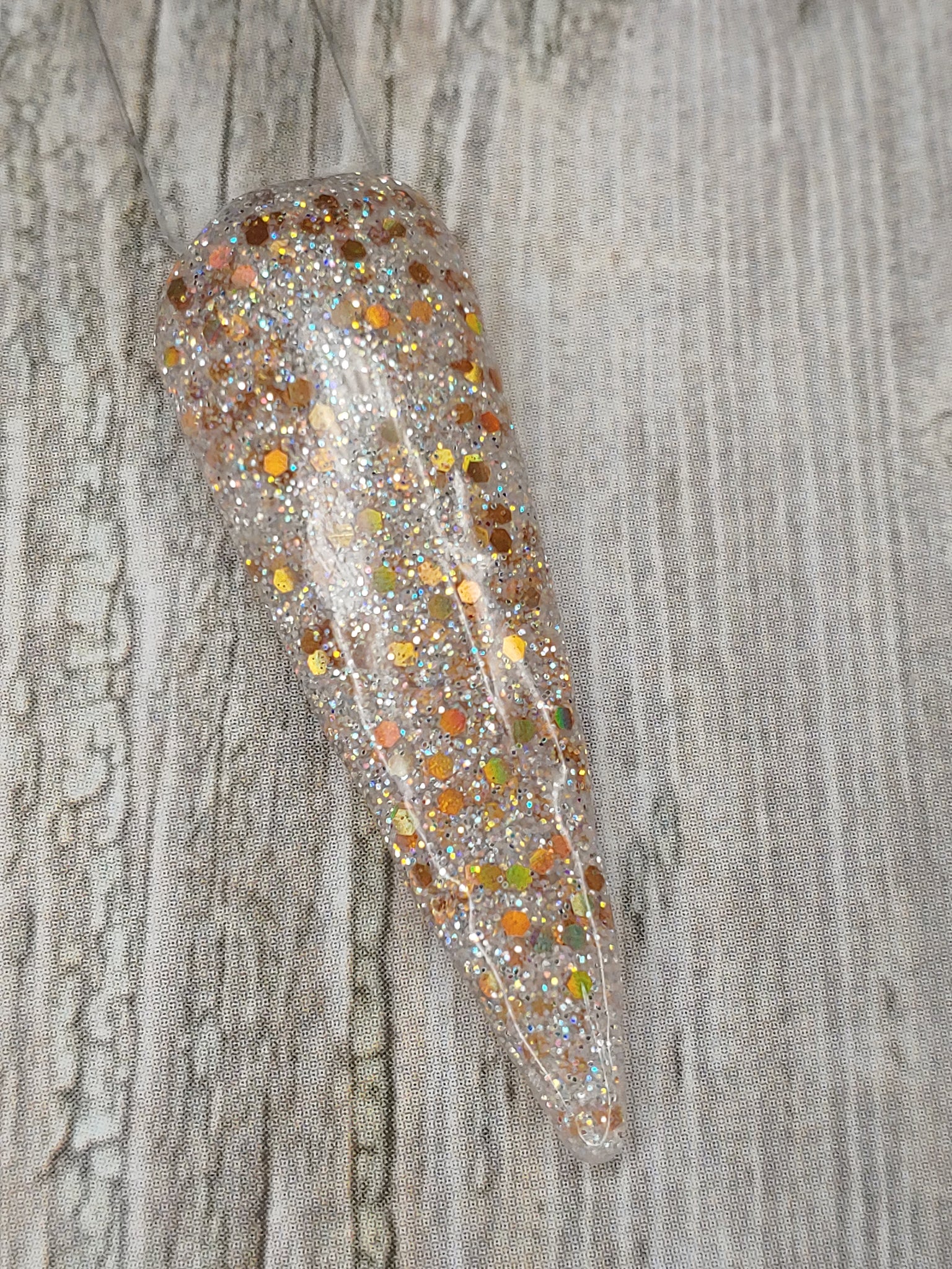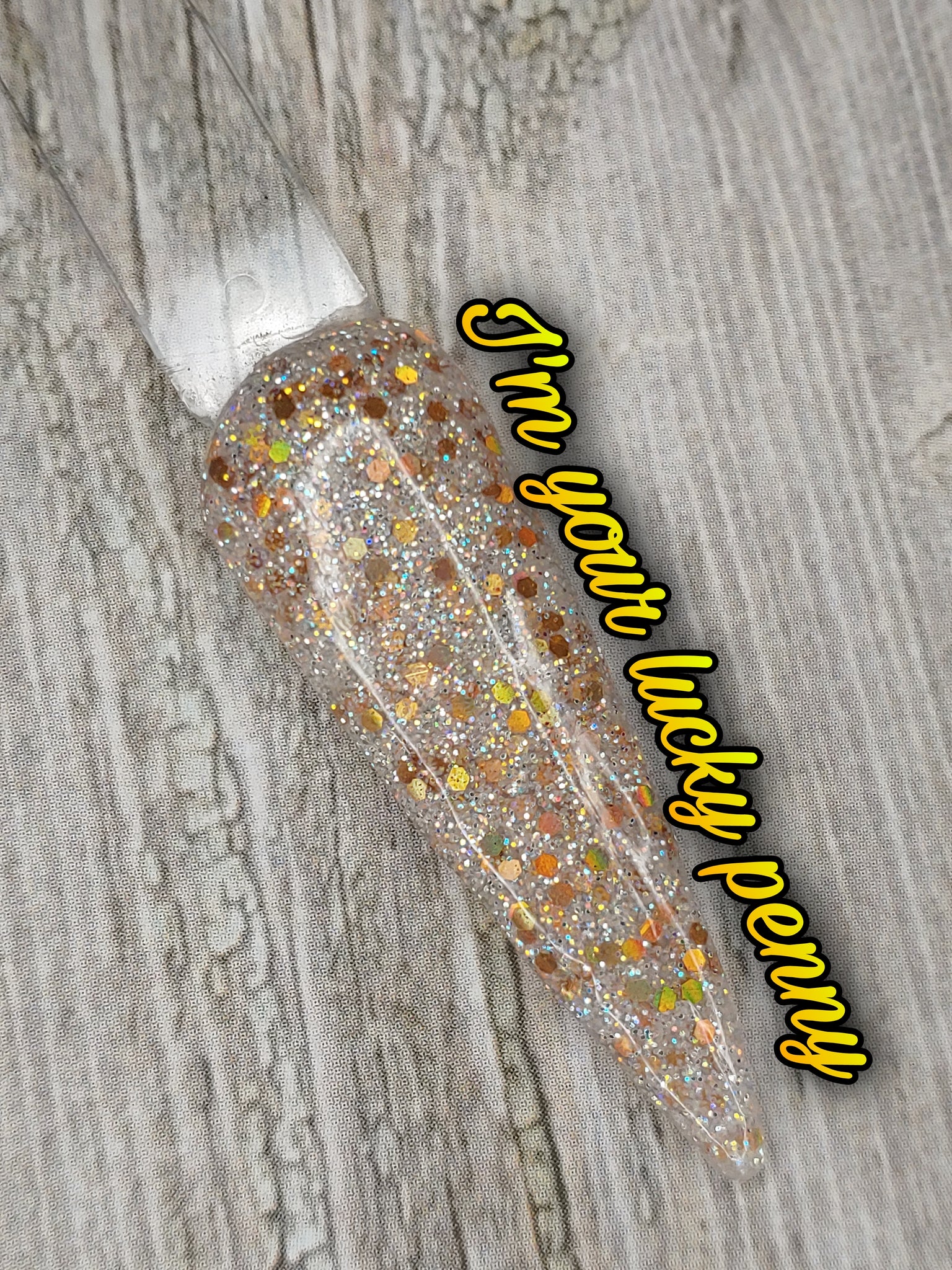 I'm Your Lucky Penny has a clear dip base with silver color-shifting glitter, iridescent glitter, and medium-sized copper color-shifting glitter.