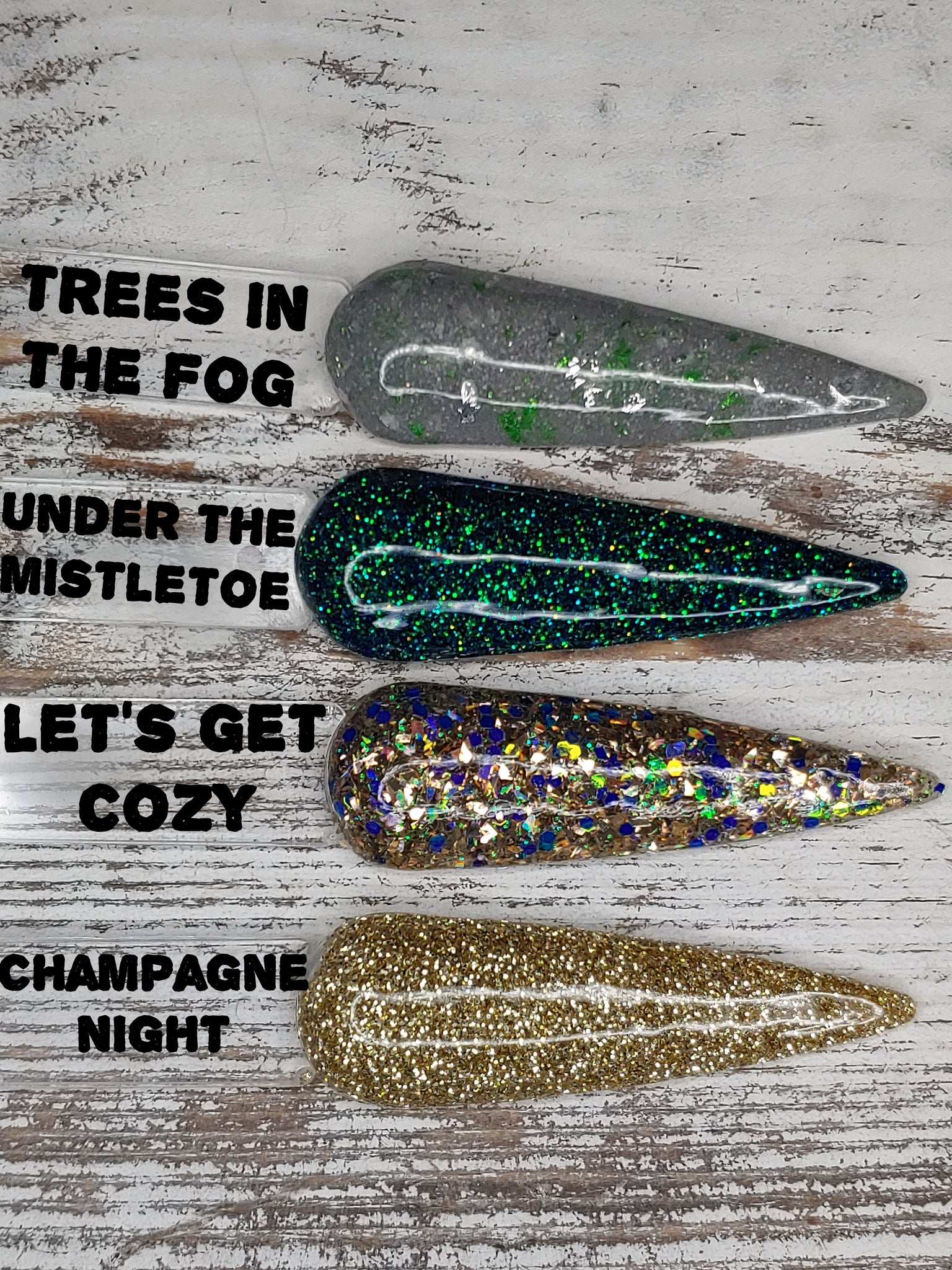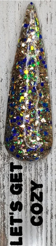 Let's Get Cozy has a clear dip base with fine gold glitter and both small and medium sized color-shifting glitter. The color-shifting glitter will show shades of blue,  green, and yellow.